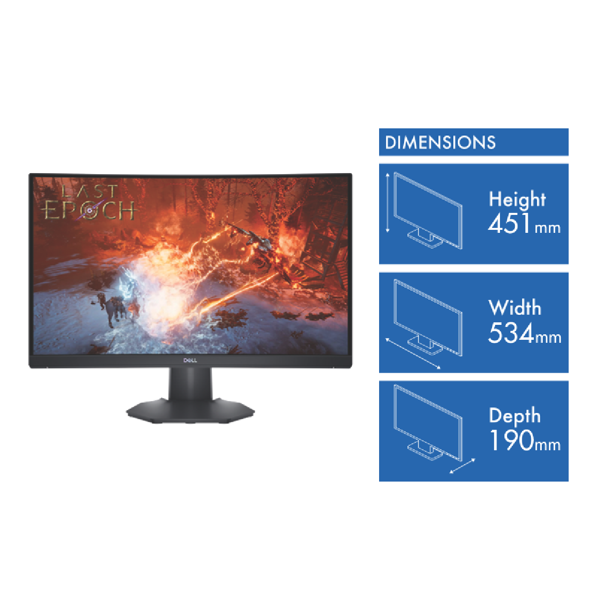 Immerse yourself in vivid crisp visuals with the Dell 24 FHD Curved Gaming Monitor. This curved LED gaming monitor delivers an immersive viewing experience with its wrap-around screen and Full HD 1920 x 1080 resolution. AMD FreeSync technology enables smooth tear-free gameplay by synchronizing the monitor's 165Hz refresh rate to your compatible GPU's frame rate. The fast 4ms response time and 1ms motion blur reduction ensure lag-free performance for first-person shooters racers and more. The 3000:1 contrast ratio and 350 cd/m2 brightness deliver deep blacks and vivid colors across the entire 16:9 widescreen. Connect your gaming PC via HDMI or DisplayPort and plug in headphones directly through the built-in audio jack. Adjust viewing angles easily and arrange your setup how you like with the flexible stand and Dell Easy Arrange feature. The anti-glare screen with 99% sRGB color coverage displays images true to life with reduced reflections. Flicker-free tech and blue light filters help minimize eye strain during marathon sessions. Crafted with a sleek black design convenient cable management hole and VESA mount compatibility this well-rounded 24-inch curved gaming monitor is built for the long haul. The manufacturer's part number for this product is S2422HG. Check out this Dell curved gaming monitor to step up your play.