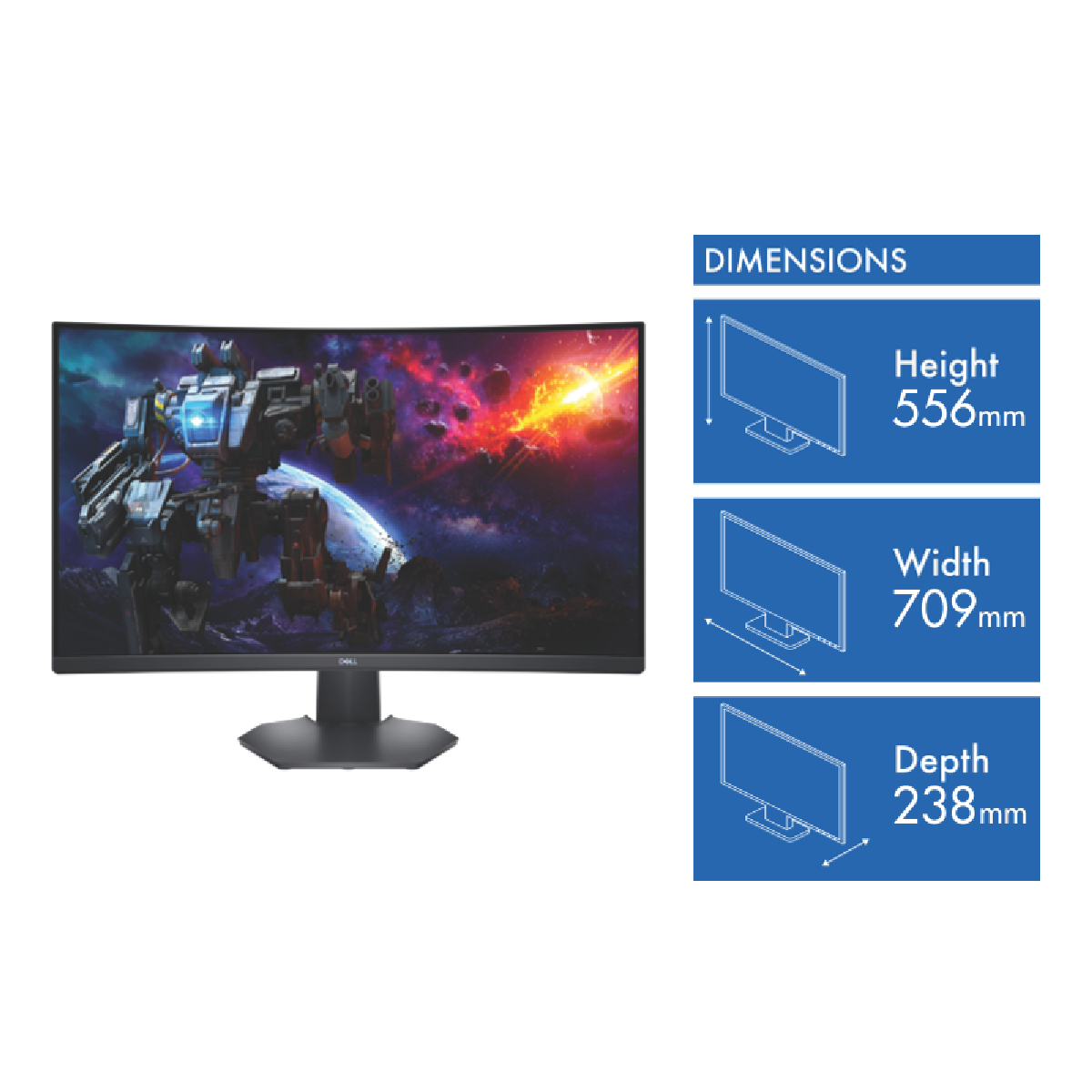 Immerse yourself in stunningly vivid QHD gaming visuals with the Dell 32 Curved Gaming Monitor. This sleek 32-inch monitor delivers an immersive curved viewing experience and AMD FreeSync technology for smooth tear-free gameplay. The 2560 x 1440 resolution and 3000:1 contrast ratio produce crisp crystal clear images while the rapid 165Hz refresh rate and ultra-fast 2ms grey-to-grey response time ensure even the fastest on-screen motion remains buttery smooth. Designed for marathon gaming sessions Dell ComfortView and integrated low blue light technology reduce eye strain. With HDMI DisplayPort and audio connectivity this monitor provides a complete setup straight out of the box. Integrated cable management and a three-sided ultrathin bezel complement any desktop. Backed by Dell's 3 year warranty for added peace of mind. Step up your gaming experience with the Dell 32 QHD Curved Gaming Monitor today. The manufacturer's part number for this product is S3222DGM.