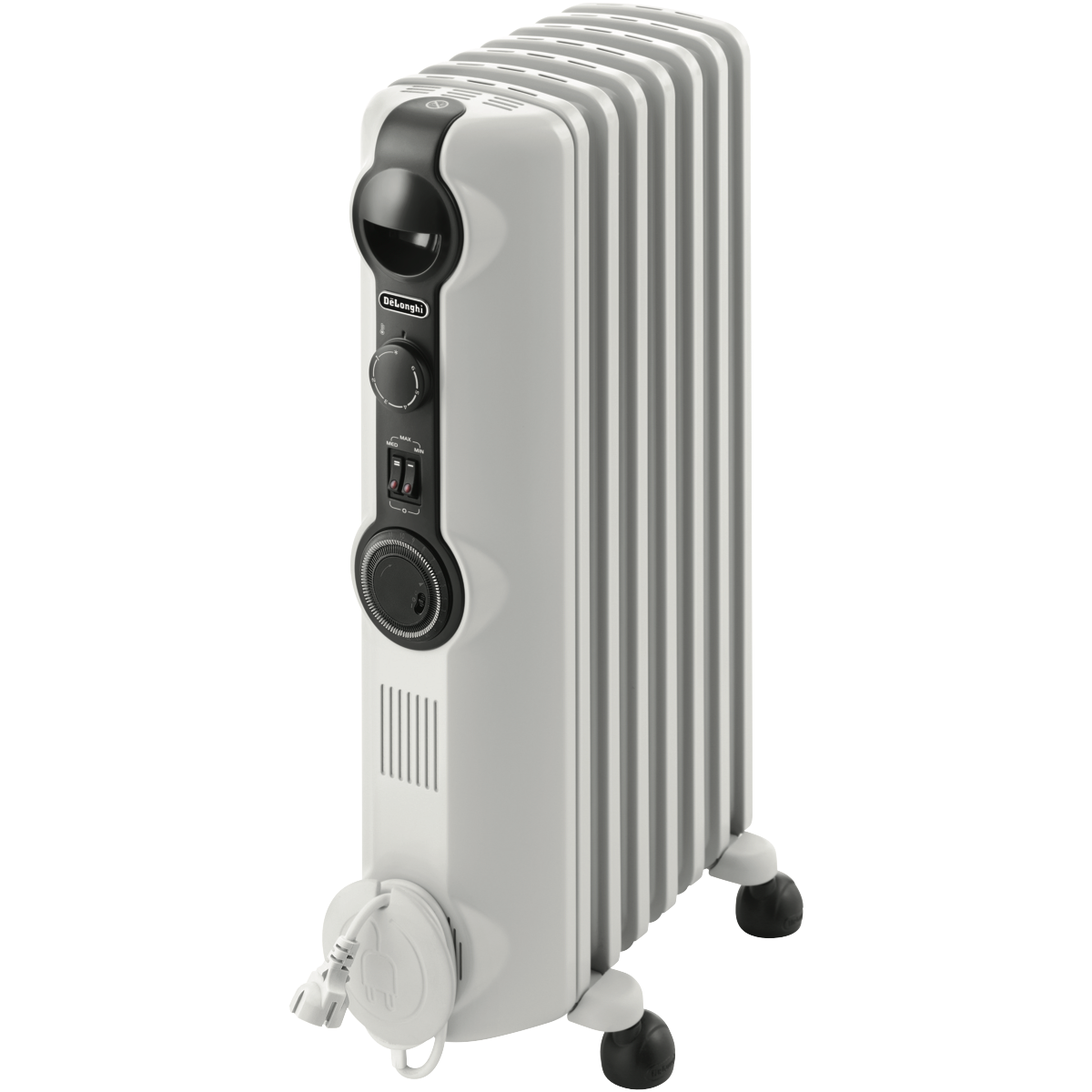 This DeLonghi 1500W Radia S Oil Column Heater w/Timer's (TRRS0715T) radiant heating enables you to produce rays of instant warmth noiselessly into a localised area. The electric powered 1500W heating element and portable design help to ensure warmth in any room. This column heater features a control panel that allows you to cycle through and select one out of the three heat settings check the thermostat set the timer and turn the heater on and off. You can easily transport comfort from room to room with this DeLonghi column heater.