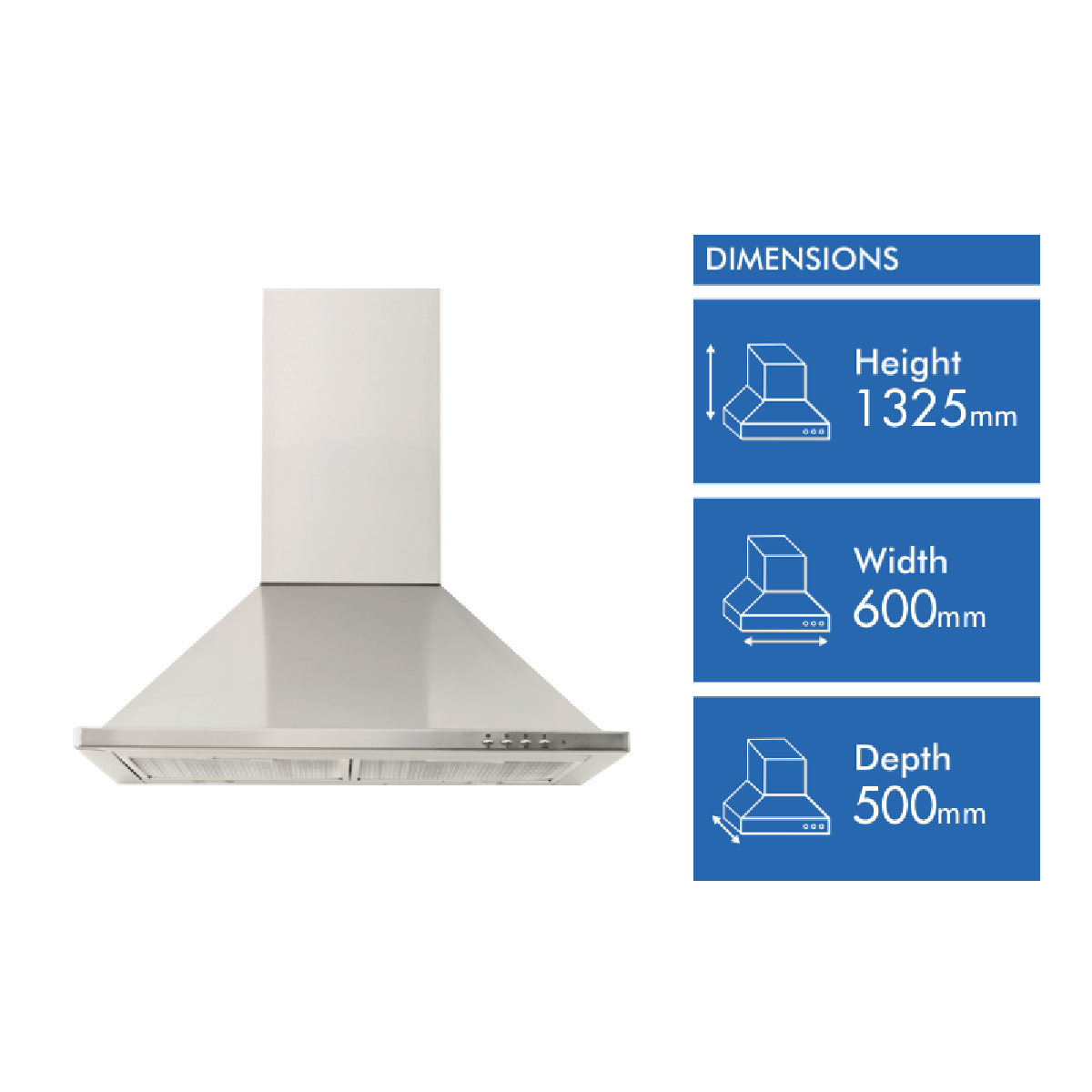 This DeLonghi rangehood is a canopy hood. It has a 1200 cu m/hr extraction capacity allowing you to keep your cooking area free of smoke and steam. Also illuminate your cooking area with the DeLonghi DEBETA60's halogen lighting. It has a centrifugal motor dishwasher safe filters and a recirculating design. The DeLonghi rangehood's electronic touch controls help you match your venting power with your cooking volume. It features a stainless steel finish. The rangehood has a 600mm width with a 1325mm height. You can boost the performance of your kitchen thanks to this DeLonghi rangehood.