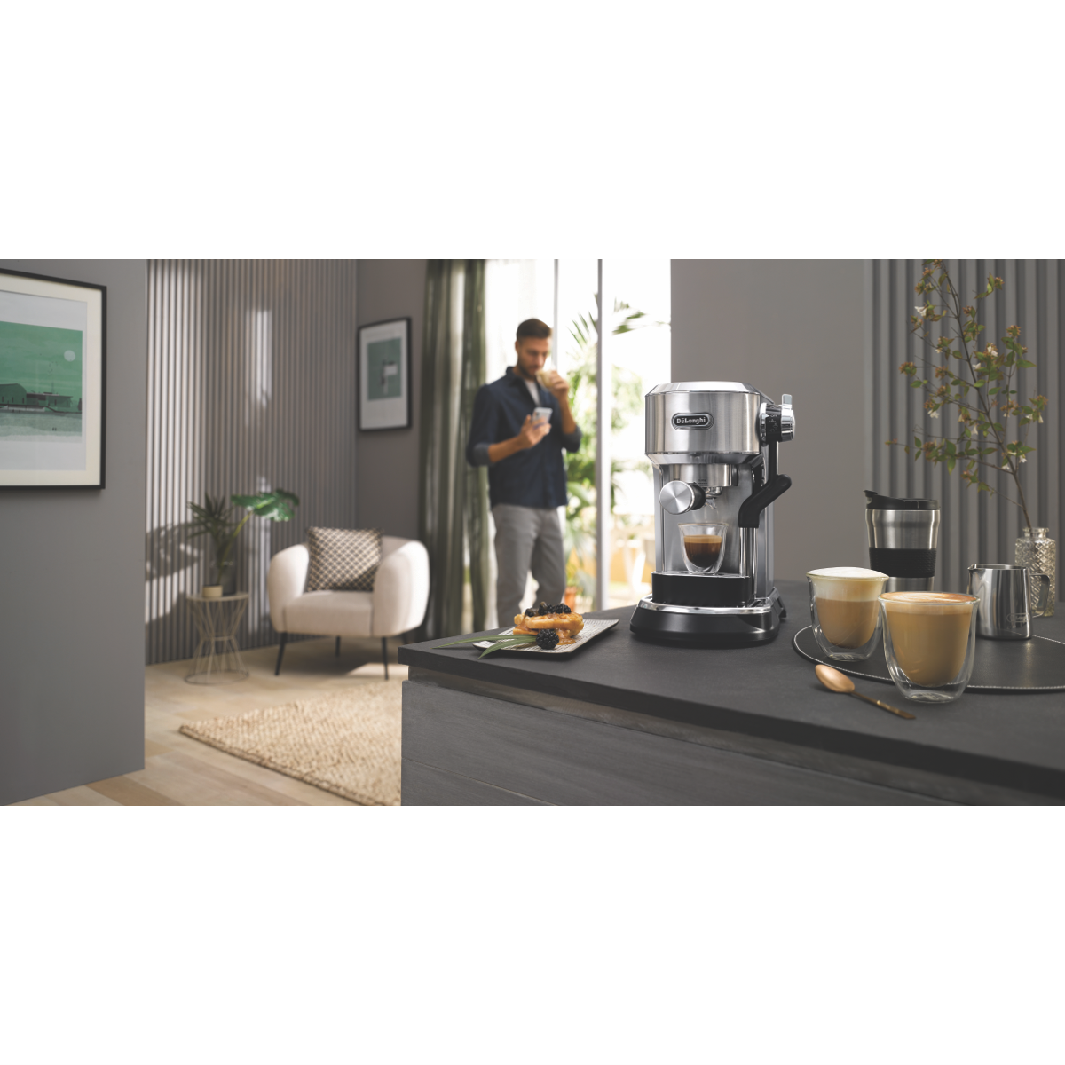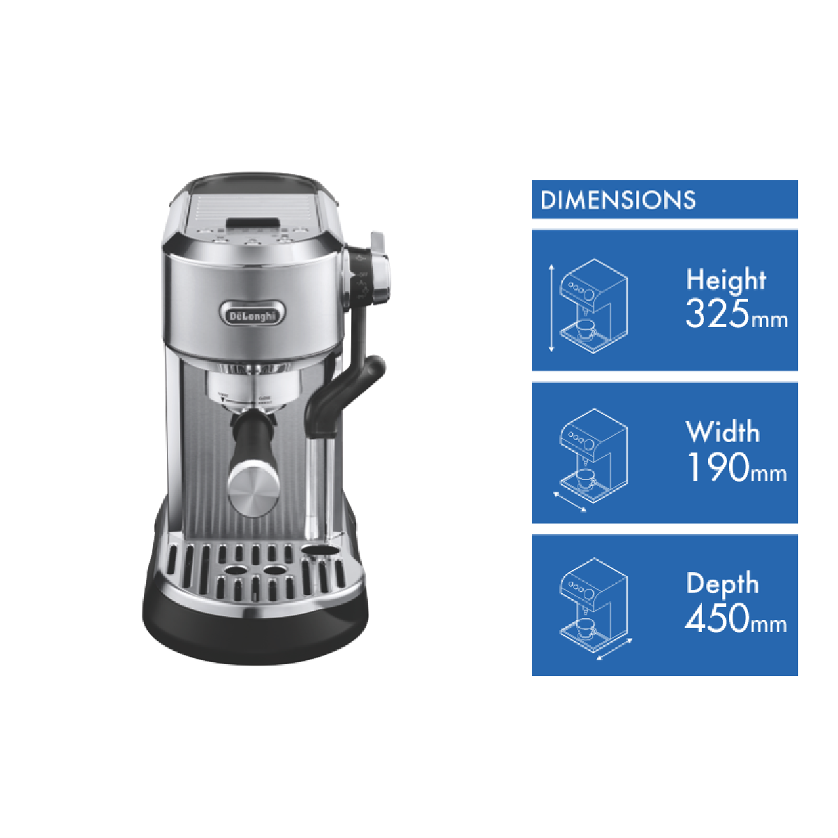 Step up your home barista skills with the DeLonghi Dedica Maestro Plus Coffee Machine. Expertly brew cafe-quality espresso cappuccino and latte art at home with this sleek manual coffee machine. The powerful 15 bar pump and stainless steel Thermoblock heating system deliver optimal extraction and precise temperature control for rich aromatic coffee. Choose from 3 coffee infusion temperatures and milk textures to create your ideal drink. The 1.6L removable water tank allows you to brew cup after cup without refilling. Automatic shutoff provides added safety and peace of mind. This Dedica Maestro coffee machine comes equipped with single and double wall filter baskets to accommodate different coffee doses up to 20g. The inclusion of a commercial style stainless steel portafilter and coffee tamper transforms your kitchen into a mini cafe. Whether you prefer short blacks long blacks flat whites or lattes this versatile coffee maker has you covered. With a compact 325mm height and 450mm depth the DeLonghi Dedica Maestro Plus Coffee Machine will fit perfectly on your kitchen benchtop without occupying too much space. Made from durable stainless steel with a stylish metal exterior this coffee machine is built to last. The manufacturer's part number for this product is EC950M. Step up your barista techniques with the DeLonghi Dedica Maestro Plus Coffee Machine today.