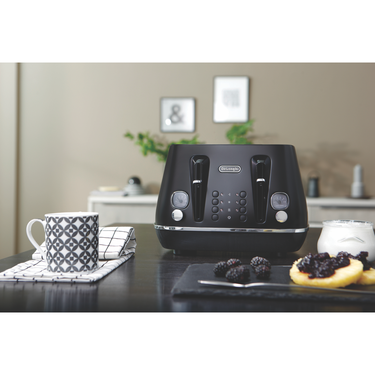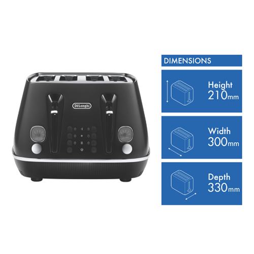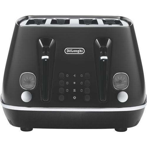 Indulge in perfectly toasted bread every time with the DeLonghi Distinta Moments 4 Slice Toaster in sophisticated black. Crafted in Italy with a chic matt metallic finish and chromed details this 1800W toaster features independent and progressive electronic browning controls so you can customize each pair of slots. The variable browning control and integrated neon indicators let you achieve the desired shade while the high lift lever and removable crumb tray make using this toaster an absolute pleasure. Defrost reheat and cancel functions provide added convenience. With the ability to toast 4 slices at once and an integrated cord storage this DeLonghi toaster will be your new favourite kitchen appliance. Bringing together impeccable style and functionality the DeLonghi Distinta is the perfect addition to any contemporary kitchen. The manufacturer's part number for this product is CTIN4003BK. Take your breakfasts to the next level with this must-have toaster from DeLonghi.