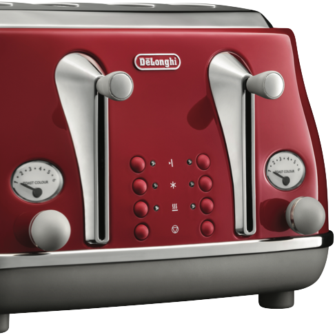 Add a splash of color to your kitchen with the DeLonghi Icona Capitals 4 Slice Toaster in vibrant Tokyo Red. This sleek high-gloss toaster not only looks great but delivers perfect toast every time thanks to advanced electronic controls with variable browning settings. The 1800 watt power output quickly toasts up to 4 slices at a time while the high lift lever makes it easy to remove smaller items. With a stainless steel body and chromed details this toaster is as durable as it is stylish. The removable crumb tray allows for easy cleaning. Enjoy convenience features like defrost reheat and neon indicator lights. Backed by a 2 year manufacturer's warranty this DeLonghi toaster will be a stylish reliable addition to your countertop for years to come. The manufacturer's part number for this product is CTOC4003R. Take your breakfast to the next level with the DeLonghi Capitals 4 Slice Toaster.