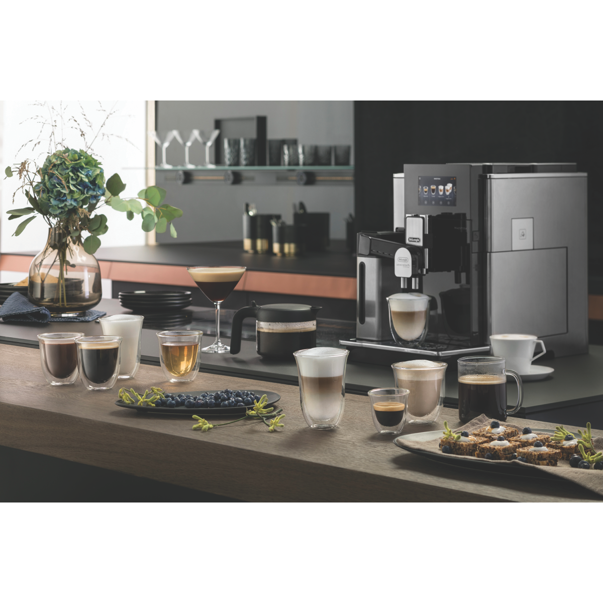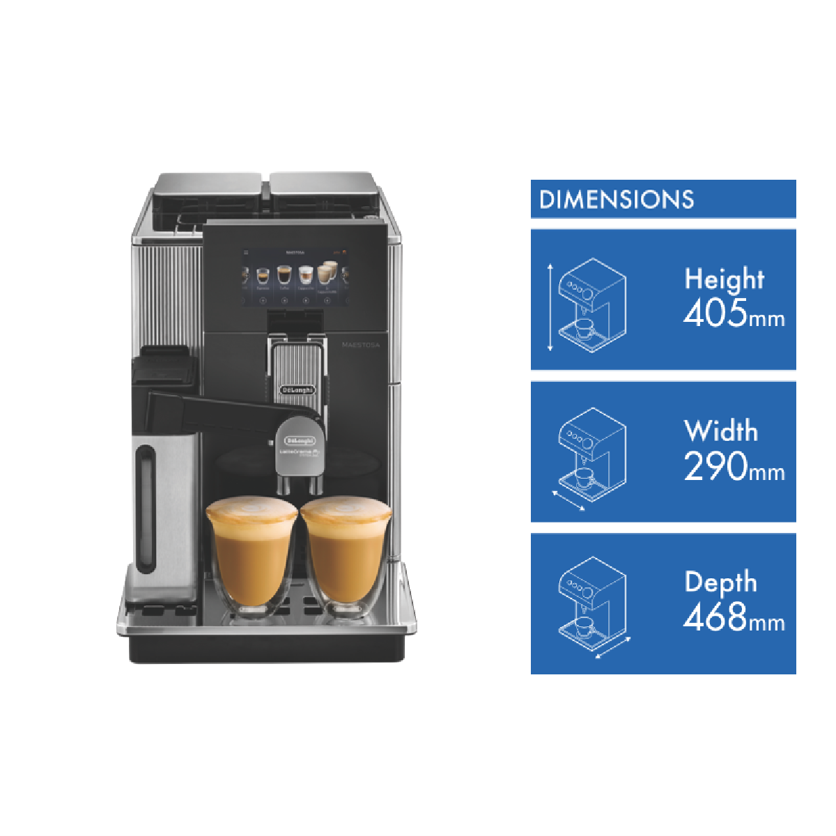 Step up your home barista game with the DeLonghi Maestosa Luxury Automatic Coffee Machine. This sleek metal black automatic coffee machine brews cafe-quality espresso and long blacks at the touch of a button. With 19 bars of pressure from its high-performance pump and Adaptive Grinding Technology the Maestosa extracts maximum flavor and aroma from your favorite coffee beans. Its 2.1L water tank lets you brew cup after cup without refilling while the 5 full color touchscreen and Coffee Link app offer effortless control. Dual bean hoppers give you the flexibility to brew two types of beans and electronically controlled grinders ensure consistent results every time. Weighing 16.8kg this 405mm high 468mm deep 290mm wide coffee machine adds stylish functionality to your kitchen. The manufacturer's part number for this product is EPAM96075GLM. Bring the spirit of your favorite cafe into your home with the DeLonghi Maestosa today.