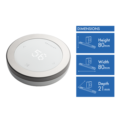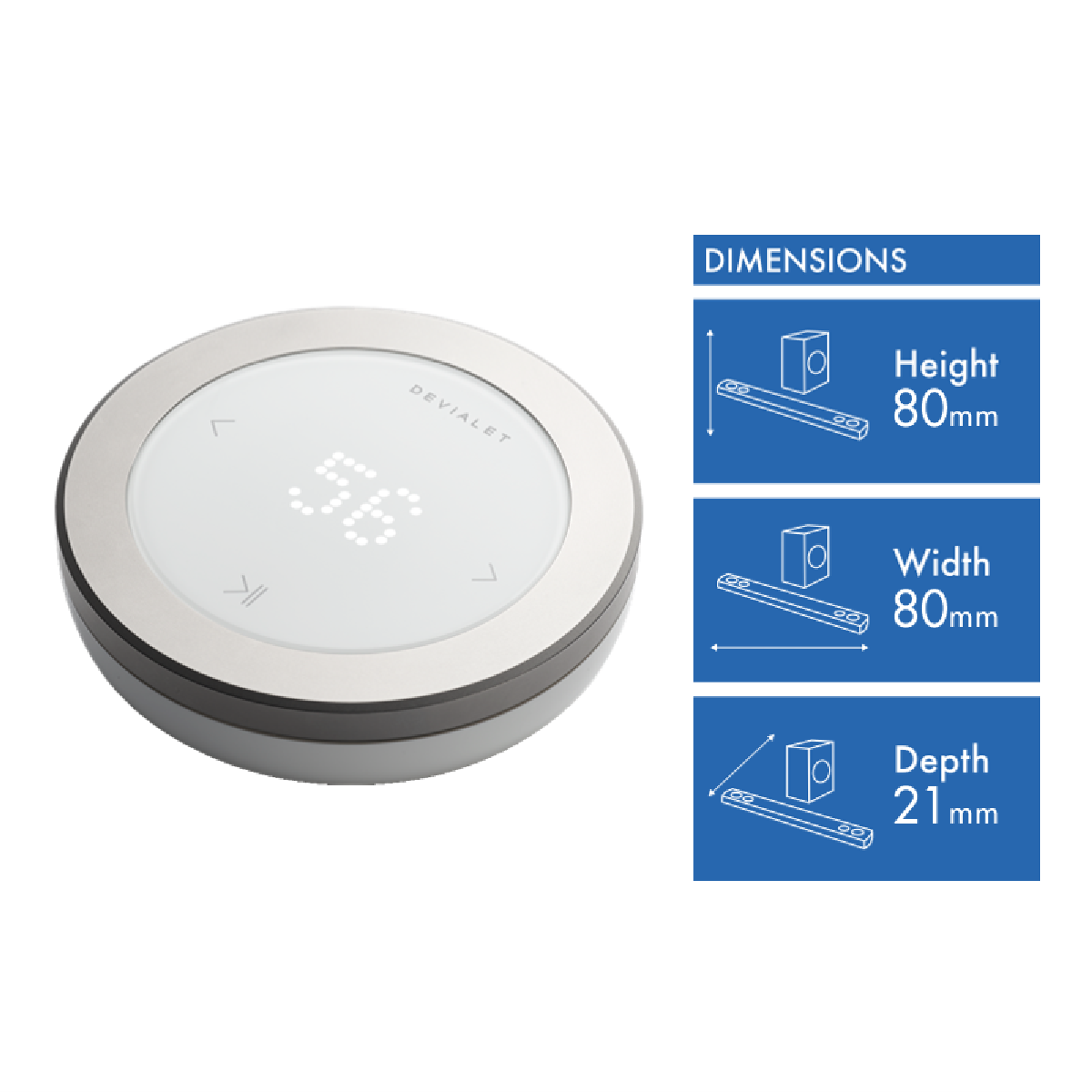 Elevate your listening experience with the sleek Devialet Phantom Remote V2 in crisp white. This remote seamlessly controls your Phantom speaker to adjust volume skip tracks and more all from the palm of your hand. Weighing just 146g the minimalist remote features a slender 80 x 80 x 21mm design that looks as good as it performs. With a range of up to 20m you can take control of your music from anywhere in the room. The intuitive interface makes operation effortless while the latest Bluetooth 5.0 technology ensures uninterrupted streaming. Crafted from durable polymers the remote is built to last for years to come. It also comes with a 2 year manufacturer's warranty for added peace of mind. The manufacturer's part number for this product is 249321. Bring wireless convenience to your Phantom speaker and order the Devialet Remote V2 today.
