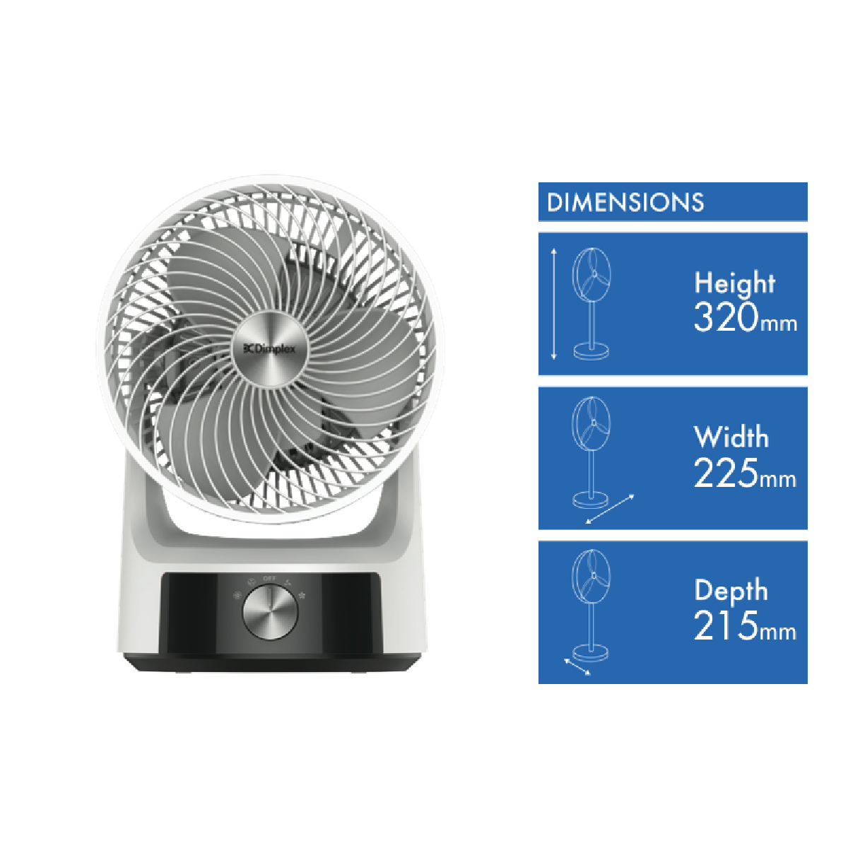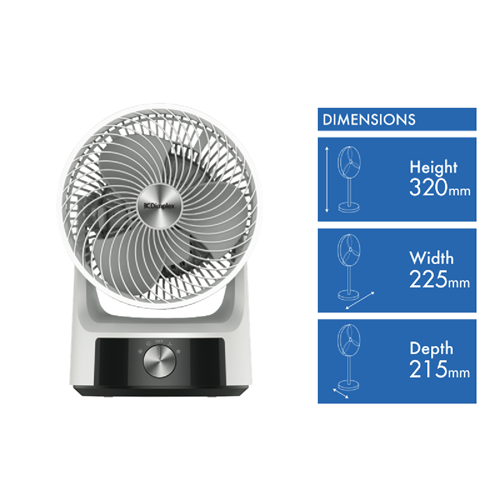 This Dimplex portable fan is a desktop fan. You can blast the air when you really need to cool down a room with its 2 speed settings. Plus the Dimplex DCACM20 has a 360 degree oscillation. It has a 320mm height a 215mm depth and a 225mm width. The Dimplex portable fan features a white finish. You can conserve energy by only cooling the space you are using with help from this Dimplex portable fan.