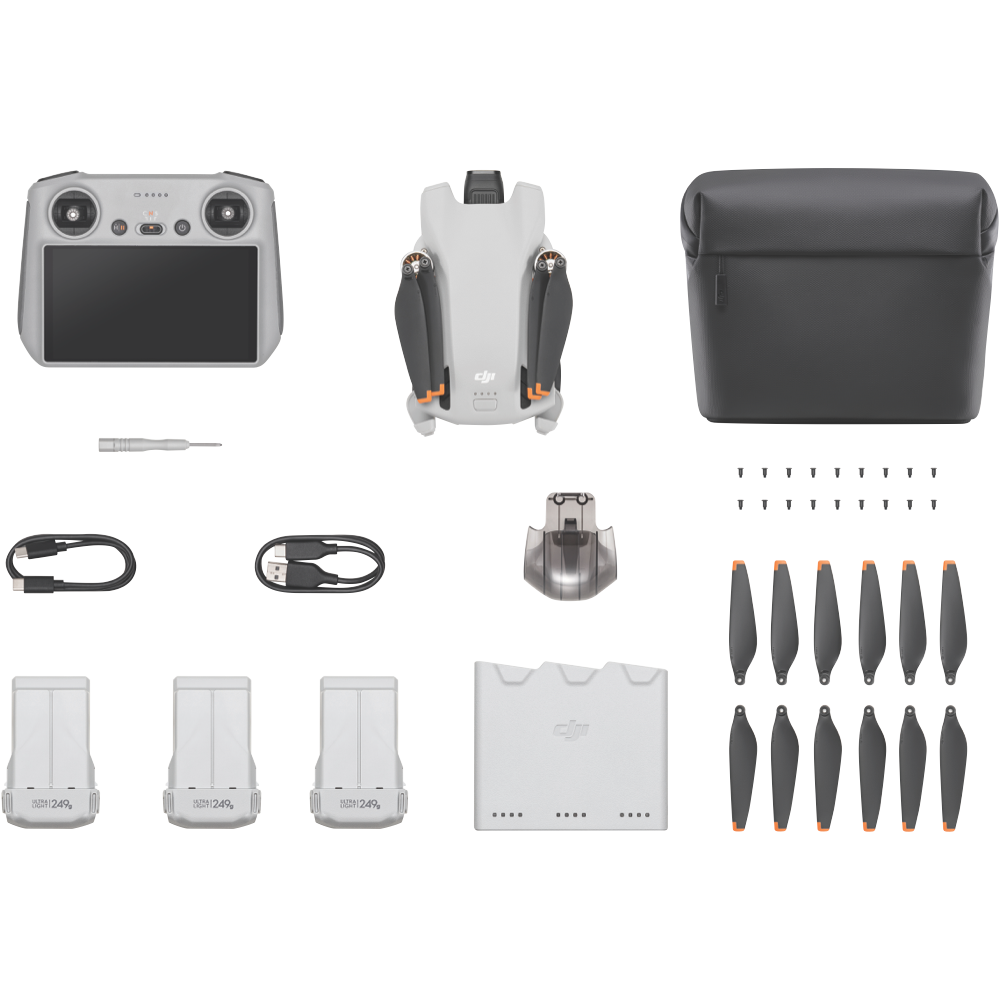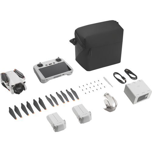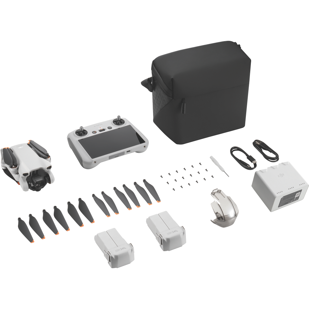 Included in Mini 3 Fly More Combo (DJI RC) pack: DJI Mini 3 DJI RC 3x Intelligent Flight Battery 3x Spare Propellers (Pair) 18x Spare Screws Screwdriver Gimbal Protector Type-C to Type-C PD Cable USB-C Cable Shoulder Bag and Two-Way Charging Hub.