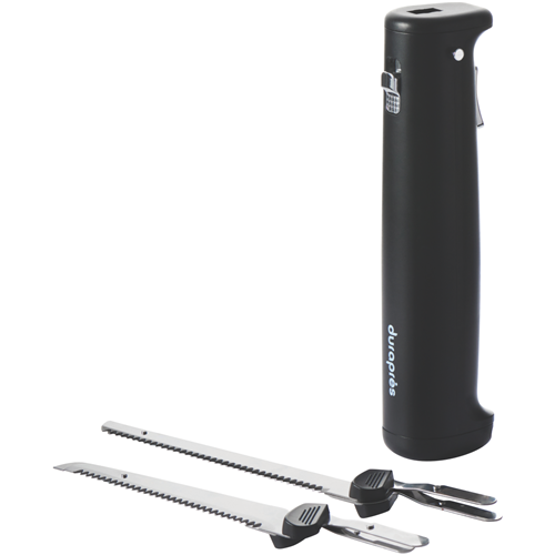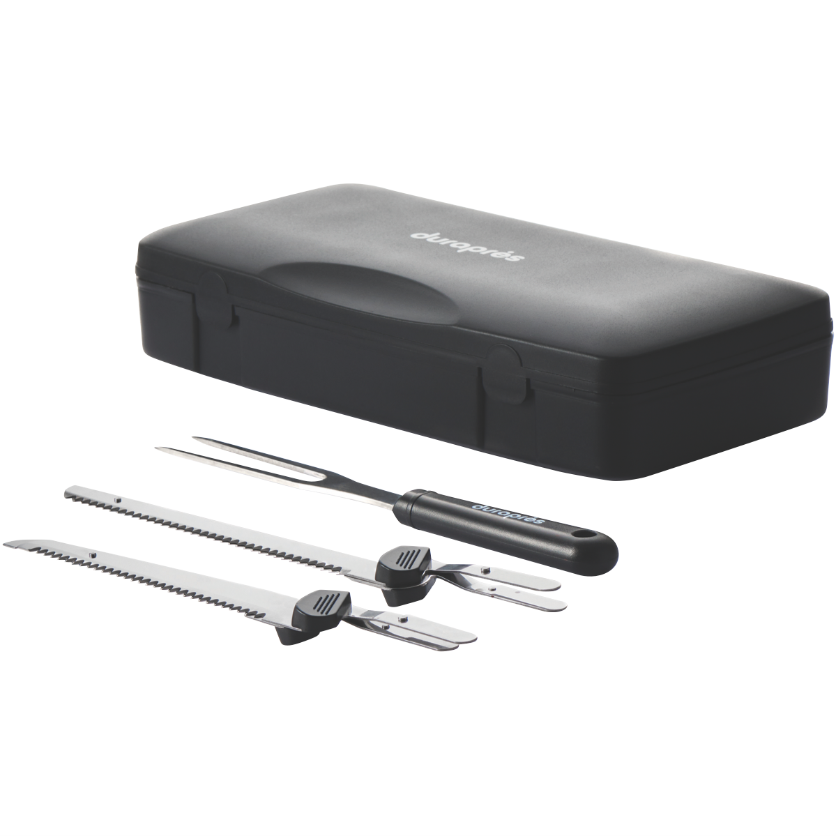 Want to make carving and slicing a breeze? The Durapres Cordless Carve Electric Knife Set is here to help. This handy tool comes with a bread knife and carving knife attachment perfect for tackling different foods. The double trigger safety feature keeps you protected while the quick release button lets you remove blades easily. Its ergonomic handle feels comfy in your hand making long carving sessions less tiring. Plus it's cordless and rechargeable so you can use it anywhere in the kitchen. The set includes a carving fork and a case to keep everything tidy. With stainless steel blades that are dishwasher safe cleanup is a snap. The DCK550 comes with a 2-year warranty for peace of mind.