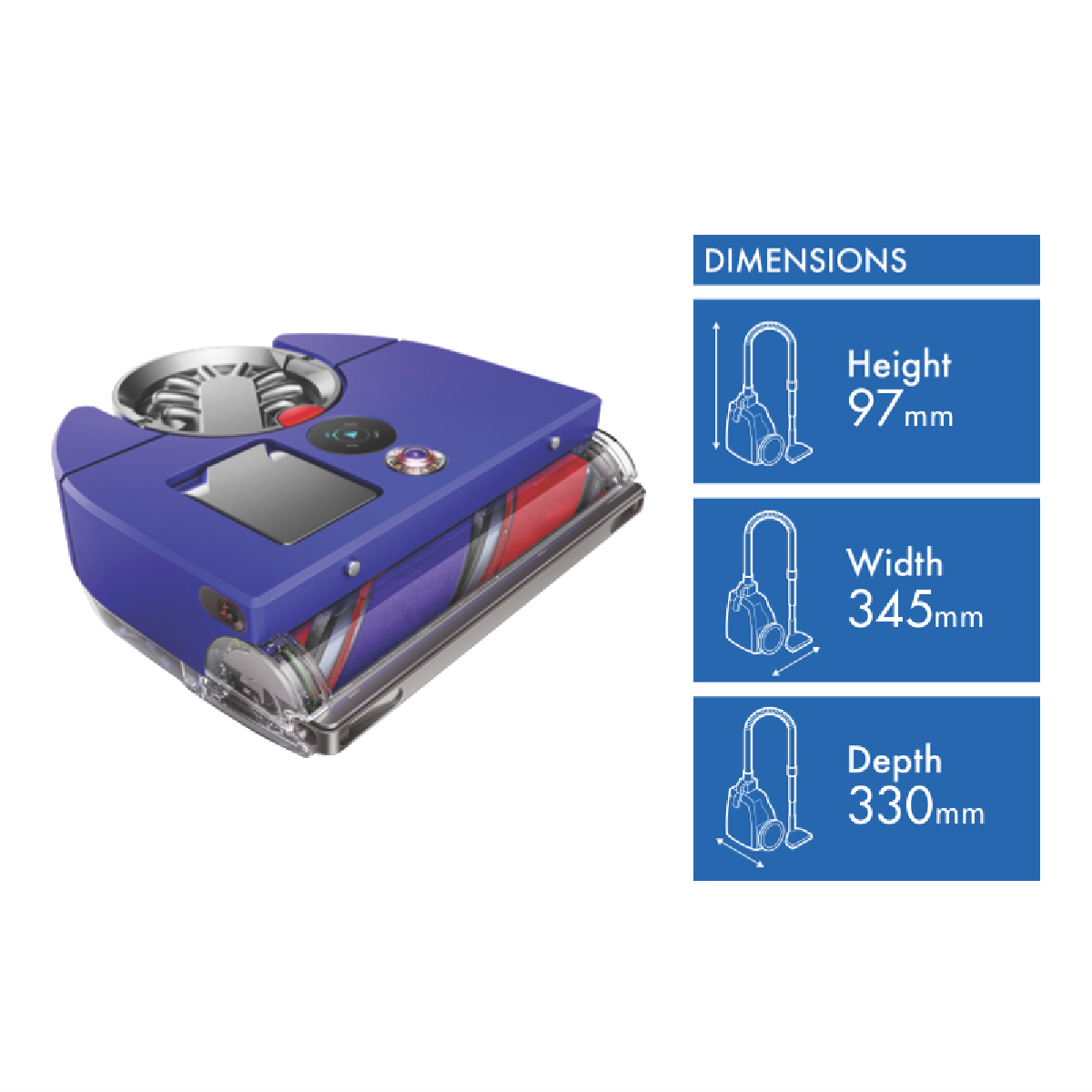 Dyson's 360 Vis Nav(TM) Robot Vacuum (304640-01) provides 360° vision in the most powerful robot(1) it sees where it needs to clean and remembers where it's been just like you would. 26 sensors for obstacle avoidance and dual-link suspension so it doesn't get stuck. An extending side duct automatically redirects suction powerful enough to capture dust and debris right up to the wall. A low profile allows the robot to clean under furniture while an LED light ring helps it navigate in low light and corners. Clean wherever you are control customise and schedule your robot remotely with the MyDyson(TM) smart home app. Clean your home whether you're there or not. Dyson's fully sealed HEPA filtration system traps dust and seals in 99.99% of particles as microscopically small as 0.1 microns(2). Deep cleans on all floors with full-width brush bar that cleans right to the edge. Black anti-static carbon fibre filaments extract fine dust from hard floors stiff nylon bristles remove ground-in dirt from carpets and soft woven nylon captures large debris Engineered with a wide diameter to reduce hair tangling. Set you robot to Quiet mode to keep things peaceful for pets. Up to 50 minutes of run time(3) it intelligently monitors battery level and returns to dock to recharge when needed before going back to finish the job. Set rules and routines switch off the brush bar motor for quiet spaces and deep-pile rugs define no-climb zones or set areas to avoid altogether. A lifetime of easy maintenance clean after clean your robot will tell you when it needs attention and guide you with simple instructions. Empty the bin in a single hygienic action. The brush bar and lifetime filter can be washed ready to go again.Disclaimers: (1)Suction testing based on IEC 62885-4 CL5.8 and CL5.9 loaded to bin full in Boost mode against robot vacuums (market sales data from Jan 2022 to Dec 2022). Tested in SLG Germany from 2021-2023.(2)Filtration tested against ASTM F3150 in Boost mode by independent third party SGS US in 2022.(3)In Quiet mode in unobstructed environment. Actual run time may vary based on power mode floor type.(4)Suction testing based on IEC 62885-4 CL5.8 and CL5.9 loaded to bin full in Boost mode. Tested in SLG Germany in 2021.(5)Suction power automatically reacts in Auto mode only. Microscopic dust is defined as particles smaller than 100 microns