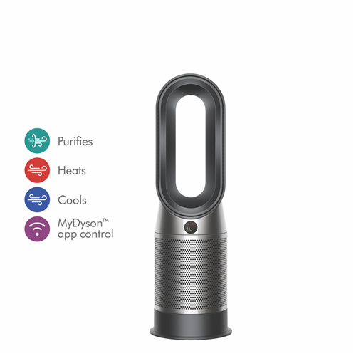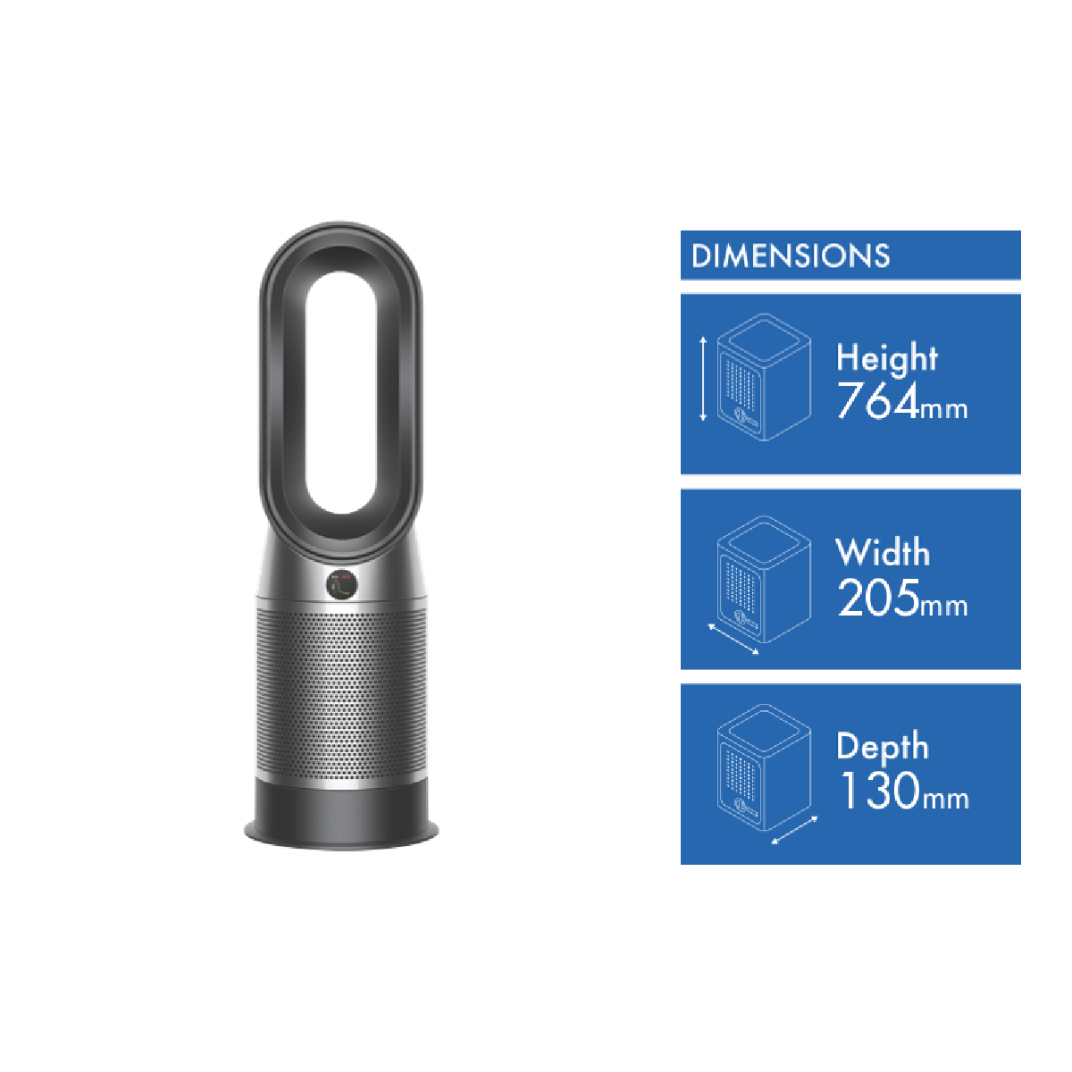 The Dyson HP07 Hot+Cool Purifying Fan (379626-01) in Black/Nickel captures dust and allergens removing up to 99.95% of particles as small as 0.1 microns(1). Automatically detects airborne particles and gases then diagnoses and reports them in real time. Air Multiplier technology generates the circulation power to purify the whole room(2). Sealed airflow and filtration system. So our whole machine not just the filter meets HEPA H13 (3) standard. What goes inside stays inside. Control and monitor air your quality from anywhere using the Dyson Link app(4). Control it hands-free with compatible voice services(5). With long-range projection it's quick to heat the whole room evenly(6). In warmer weather a powerful stream of purified airflow can cool you down. Disclaimers: (1) Tested for filtration efficiency at 0.1 microns (EN1822). (2) In maximum setting. Tested for air projection purification coverage in a 81m3 room. (3) Particle challenge by DEHS oil specified in EN1822 within a chamber specified in ASTM F3150. Tested in Max Mode at IBR US for whole machine efficiency above 99.95%. (4) Requires device to run app Wi-Fi or mobile data Bluetooth 4.0 support and iOS version 10 or Android version 5 (or above). Standard data and messaging rates may apply. (5) Refer to the Dyson Link app for compatible voice services. (6) In maximum setting. Tested for air projection purification coverage in a 81m3 room and heating performance in a 35m3 room.