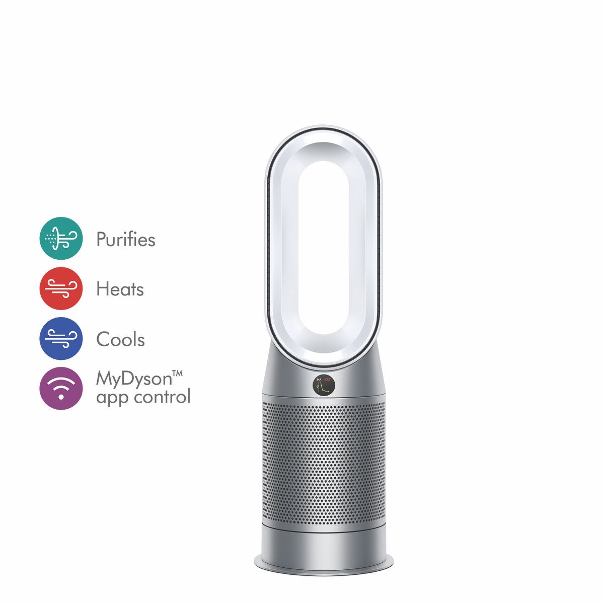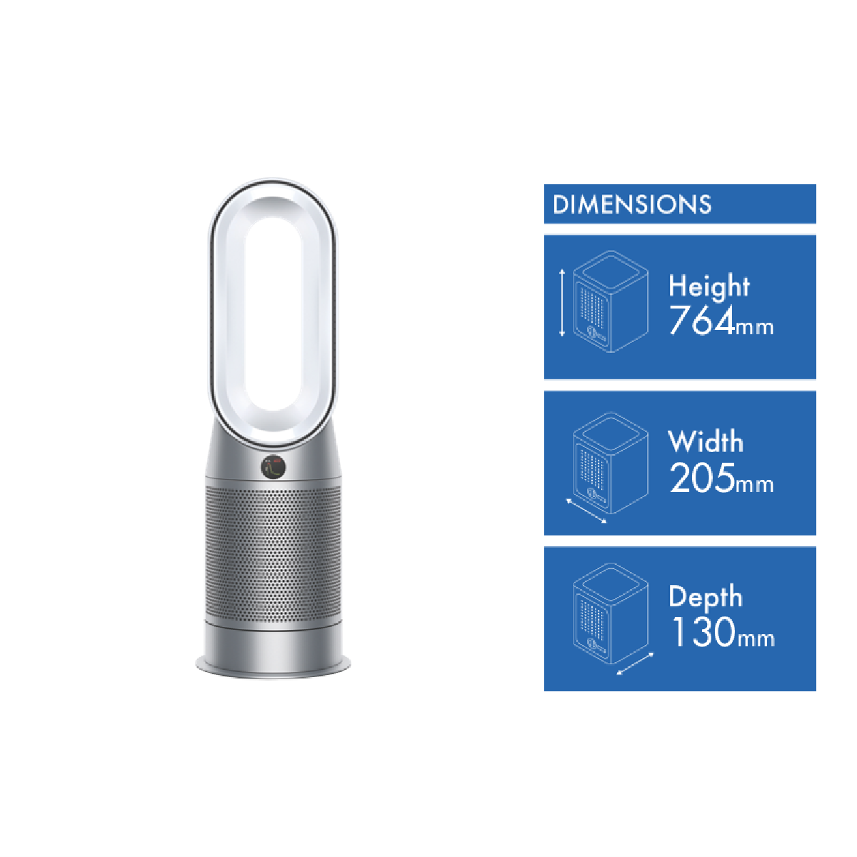 The Dyson HP07 Hot+Cool Purifying Fan (368801-01) in White/Silver captures dust and allergens removing up to 99.95% of particles as small as 0.1 microns(1). Automatically detects airborne particles and gases then diagnoses and reports them in real time. Air Multiplier technology generates the circulation power to purify the whole room(2). Sealed airflow and filtration system. So our whole machine not just the filter meets HEPA H13 (3) standard. What goes inside stays inside. Control and monitor air your quality from anywhere using the Dyson Link app(4). Control it hands-free with compatible voice services(5). With long-range projection it's quick to heat the whole room evenly(6). In warmer weather a powerful stream of purified airflow can cool you down. Disclaimer: (1) Tested for filtration efficiency at 0.1 microns (EN1822). (2) In maximum setting. Tested for air projection purification coverage in a 81m3 room. (3) Particle challenge by DEHS oil specified in EN1822 within a chamber specified in ASTM F3150. Tested in Max Mode at IBR US for whole machine efficiency above 99.95%. (4) Requires device to run app Wi-Fi or mobile data Bluetooth 4.0 support and iOS version 10 or Android version 5 (or above). Standard data and messaging rates may apply. (5) Refer to the Dyson Link app for compatible voice services. (6) In maximum setting. Tested for air projection purification coverage in a 81m3 room and heating performance in a 35m3 room.