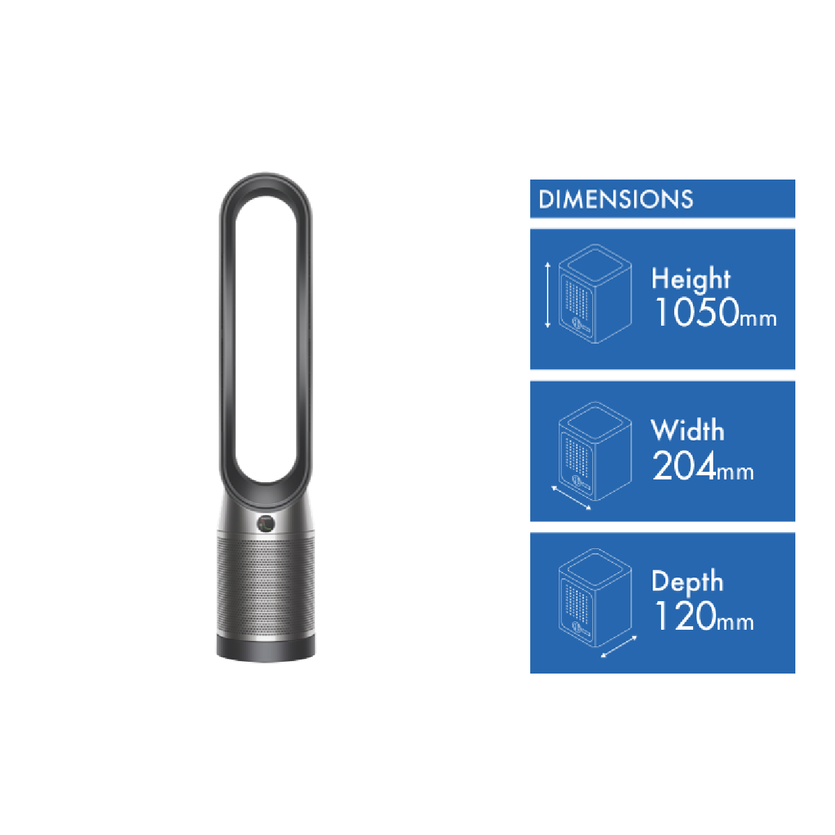 The Dyson TP07 Pure Cool Tower Fan (379532-01) in Black/Nickel captures dust and allergens removing up to 99.95% of particles as small as 0.1 microns(1). Automatically detects airborne particles and gases then diagnoses and reports them in real time. Air Multiplier technology generates the circulation power to purify the whole room(2). Sealed airflow and filtration system. So our whole machine not just the filter meets HEPA H13 (3) standard. What goes inside stays inside. Acoustically engineered to be 20% quieter than the previous model(4). Control and monitor air quality from anywhere using the Dyson Link app(5). Control it hands-free with compatible voice services(6). Disclaimers: (1) Tested for filtration efficiency at 0.1 microns (EN1822). (2) In maximum setting. Tested for air projection purification coverage in a 81m3 room. (3) Particle challenge by DEHS oil specified in EN1822 within a chamber specified in ASTM F3150. Tested in Max Mode at IBR US for whole machine efficiency above 99.95%. (4) Dyson Pure Cool TP04. (5) Requires device to run app Wi-Fi or mobile data Bluetooth 4.0 support and iOS version 10 or Android version 5 (or above). Standard data and messaging rates may apply. (6) Refer to the Dyson Link app for compatible voice services. In warmer weather a powerful stream of purified airflow can cool you down.