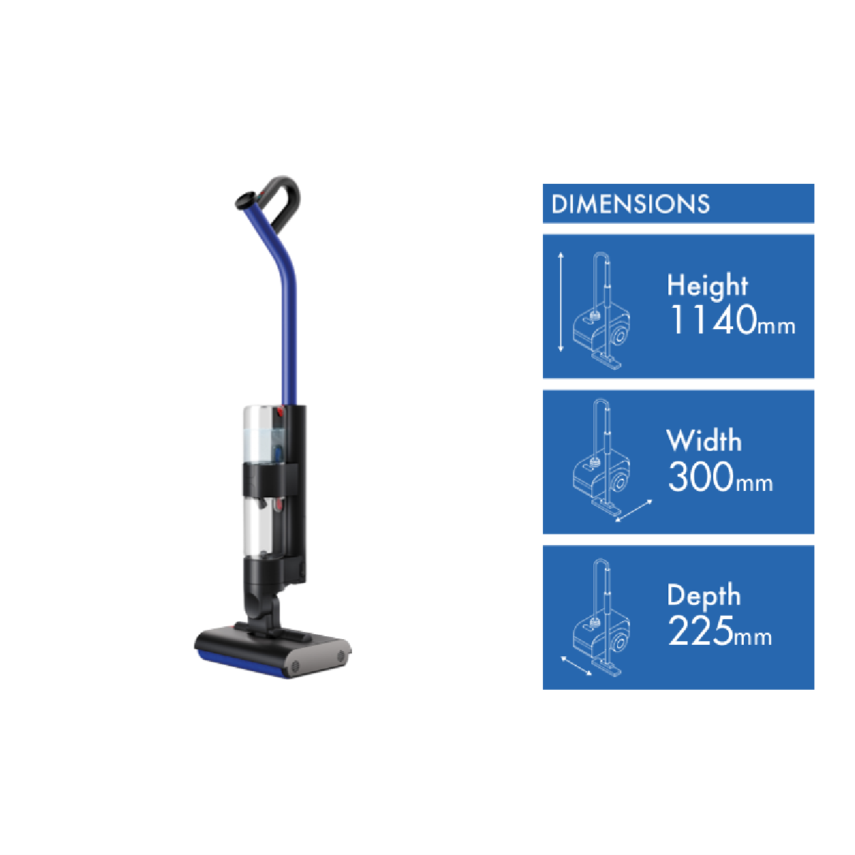 Powerful hygienic washing for all hard floors. Removes wet and dry dirt in one go Powerfully tackles spills debris and tough stains on hard floors. Covered in highly absorbent microfibre two counter-rotating motorised roller remove wet and dry debris in one go. Leaving floors sparkling clean Washes with clean water from start to finish. Covers up to 290sqm(1). 26 pulse-modulated hydration points ensure that water is evenly applied across the rollers So you clean with clean water from start to finish. Effortlessly glides Easy to manoeuvre. Even under furniture. Double rollers spin in opposite directions so Dyson WashG1 Wet Cleaner feels easy to manoeuvre. It's also designed to reach low under furniture and into awkward spaces. Clean floors Hassle-free maintenance. Secondary brush bars with nylon bristles strip dry debris from the microfibre rollers- while extraction plates squeeze off dirty water. Debris collects in a removable tray and waste liquid is pumped into a separate dirty water tank. Stopping build-up inside the machine which can lead to odor emissions.Disclaimers: (1)Based on Dyson internal calculation with no repeated cleaning on the same area with 0.5m/s speed. Actual area coverage may vary depending on habits and floor types.(2)Based on Dyson's internal testing actual operating times will vary depending on usage and type of ground.(3)According to Dyson internal methods tested on ceramic tile and wood