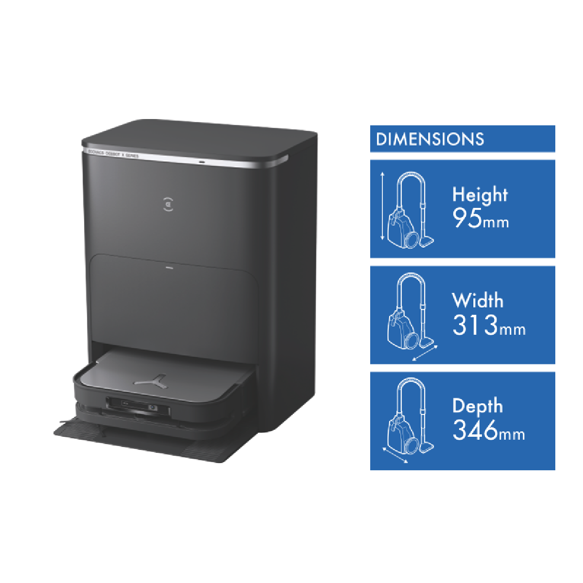 Tired of vacuuming and mopping? Let the Ecovacs DEEBOT X5 PRO OMNI robotic vacuum take care of it for you. This powerful little helper packs a punch with 12800Pa suction power and a 6400mAh battery that lets it clean for up to 224 minutes on a single 4 hour 45 minute charge. The TrueDetect 3D 2.0 sensor technology navigates your home like a pro while the ECOVACS app lets you control it all from your phone. Measuring just 313mm wide 346mm deep and 95mm high it's compact yet mighty. The DEEBOT-X5-PRO-OMNI comes with everything you need plus a generous 30 month manufacturer's warranty for peace of mind.