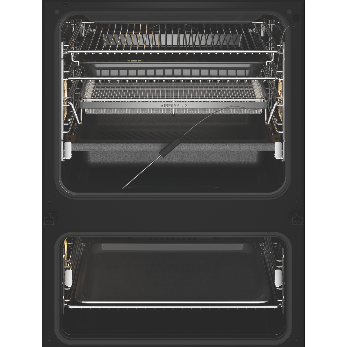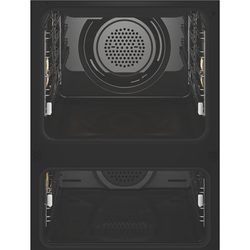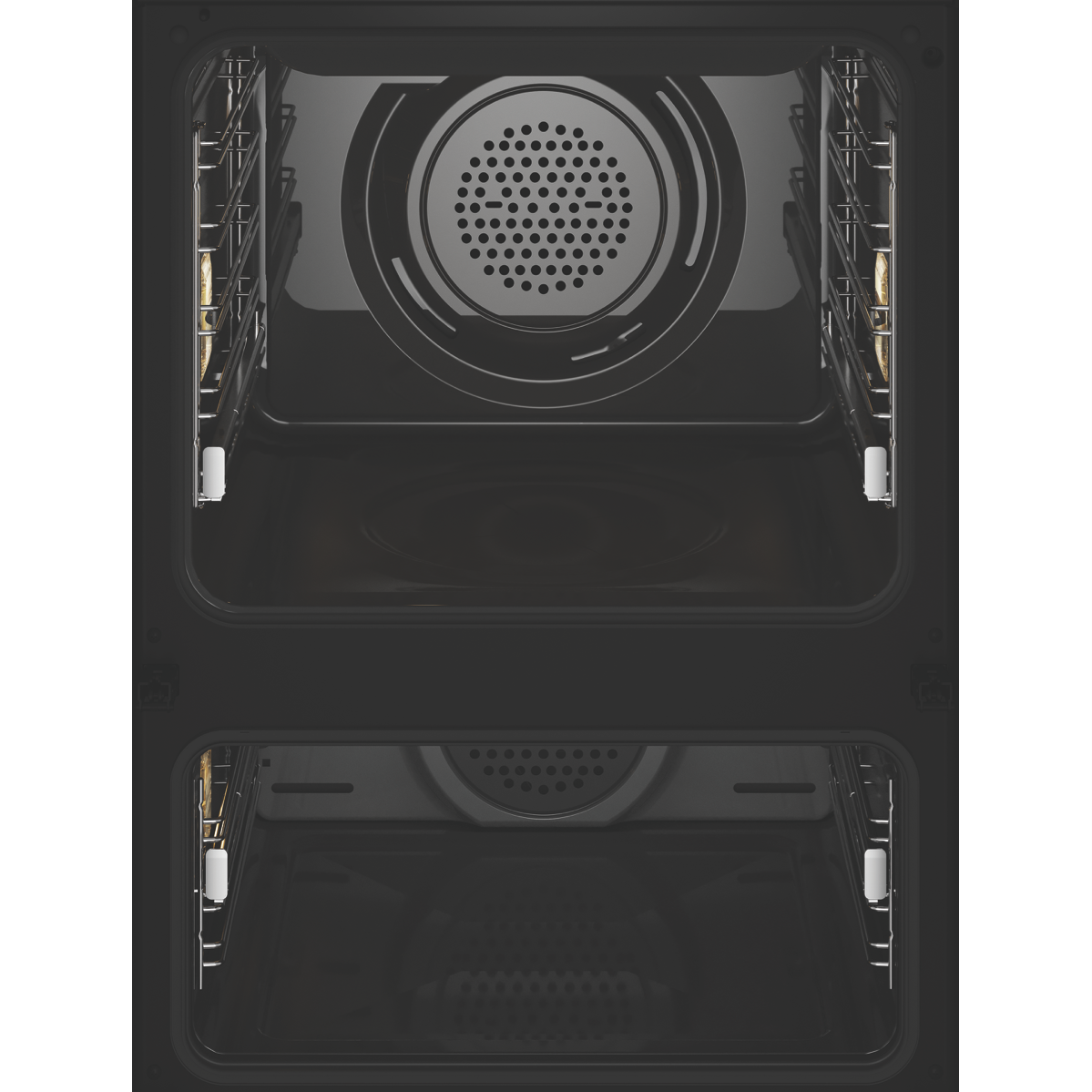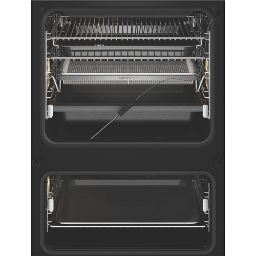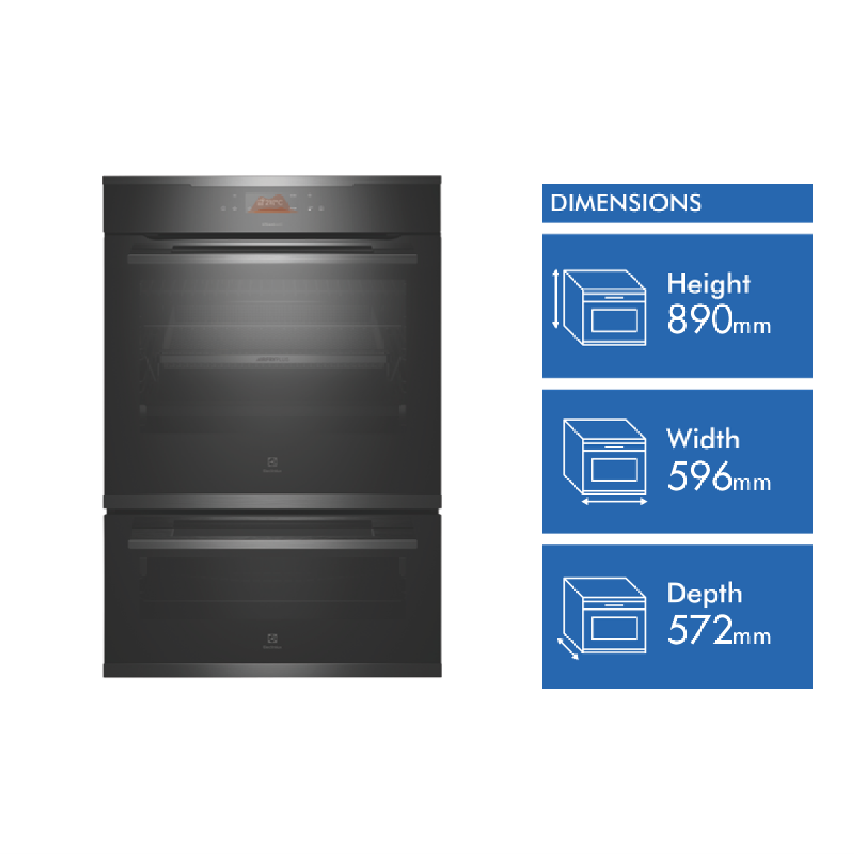 Bake with or without steam roast grill slow cook or even air fry to your heart's content with this incredibly versatile Electrolux electric double oven EVE636DSE in dark stainless steel. Two independently controlled ovens with a 72-litre usable capacity above and 38-litre usable capacity below provides plenty of space to roast a leg of lamb with veggies as you bake desserts below. This multifunction double oven features plenty of cooking functions easily accessible via the TFT touch display. Use the smart sensor food probe in conjunction with one of the cooking functions like Fan Cooking Traditional Bake Fan Assist Bake or Roast. Some functions are auto programs where the cooking function time and temperature are auto adjusted to deliver the best results when you either input the food weight or insert the food probe. To perfect bakery-style breads from home allow the combination of hot air and steam in the SteamBake setting to create crispy breads with a moist centre. This Electrolux oven comes with quadruple-glazed oven door to reduce the outside temperature of the door when the pyrolytic self-cleaning function is in play and a SoftMove door which can maintain an angled open position if needed and will close softly with a gentle push.