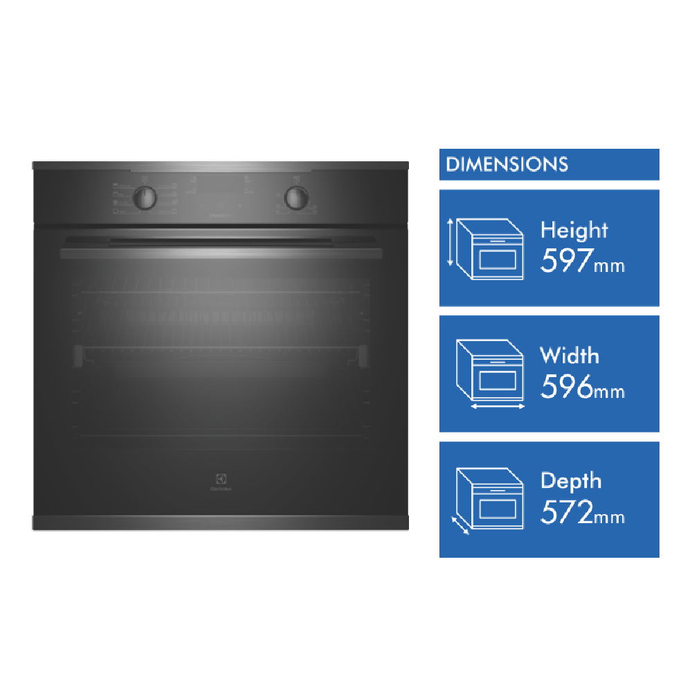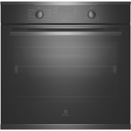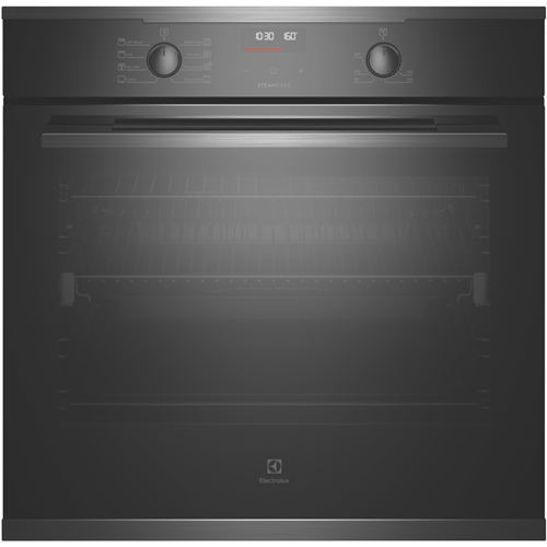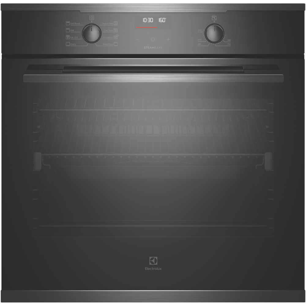 Create tasty dishes using one of eight cooking functions with the stunning Electrolux 60cm Multifunction Oven EVE614DSE in dark stainless. For crispy breads with a moist centre allow the combination of hot air and steam in the SteamBake setting to perfect bakery-style breads from home or bring frozen pre-cooked foods to the right temperature fast with the Rapid Heat function for enjoying a homemade meal or frozen packaged favourites straight out of the freezer. It has a 72-litre usable oven capacity. This Electrolux oven comes with a set of easy-glide fully extendable telescopic runners to easily and safely check up on your dinner creations while a triple-glazed oven door ensures the outside remains cool to touch. Plus the oven door frame can be easily removed and the glass panels detached from the frame to achieve a through clean. With a dark stainless-steel finish and premium-look aesthetics this electric oven integrates effortlessly into any modern kitchen.