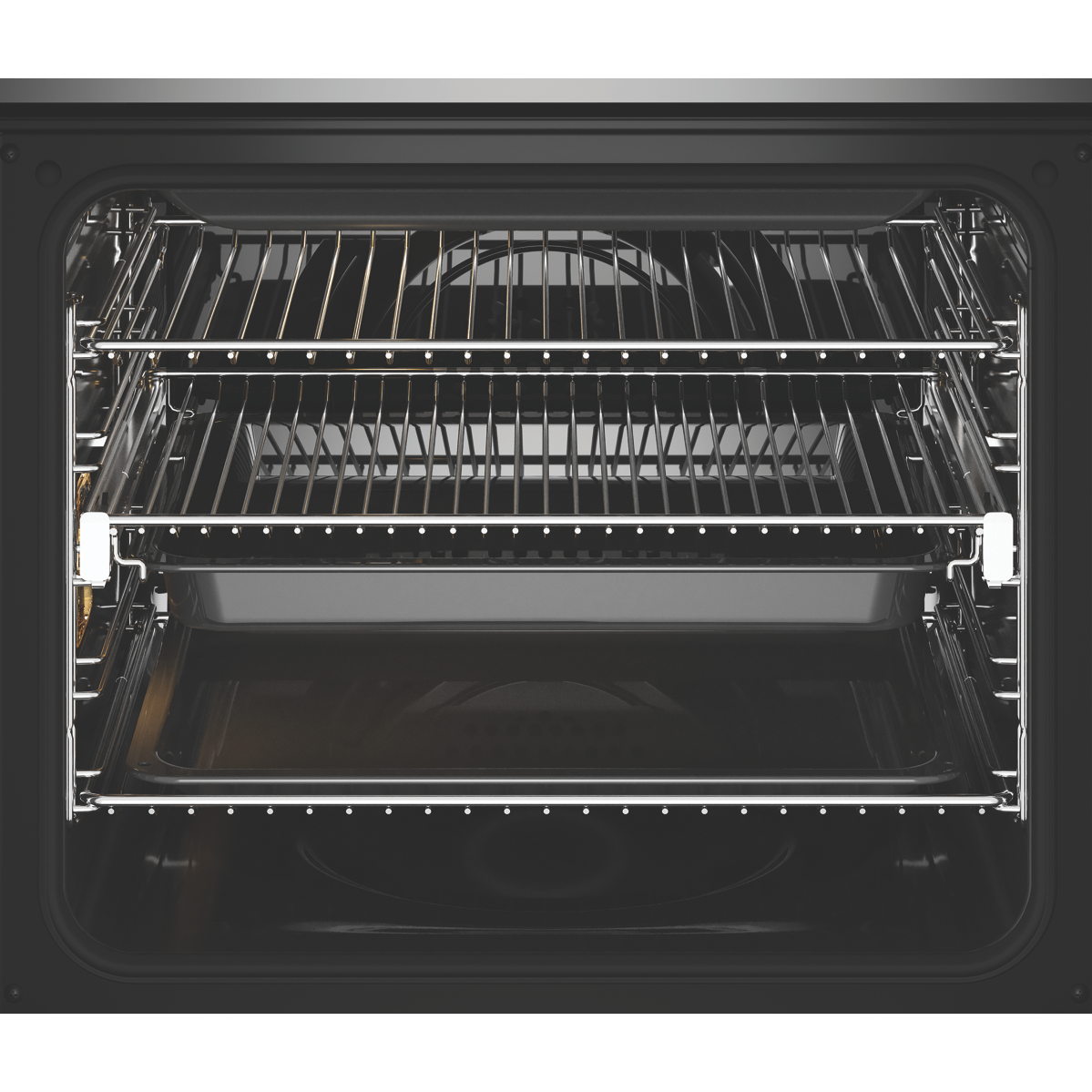 Create tasty dishes with effortless clean up with this stunning Electrolux 60cm Pyrolytic Oven EVEP614DSE in dark stainless steel. For crispy breads with a moist centre allow the combination of hot air and steam in the SteamBake setting to perfect bakery-style breads from home or bring frozen pre-cooked foods to the right temperature fast with the Cook from Frozen function for enjoying a homemade meal or frozen packaged favourites straight out of the freezer. It has a 72-litre usable oven capacity. This Electrolux oven comes with a set of easy-glide fully extendable telescopic runners to easily and safely check up on your dinner creations while a quadruple-glazed oven door ensures the outside to reduce the outside temperature of the door when the pyrolytic self-cleaning function is in play. Plus the oven door frame can be easily removed and the glass panels detached from the frame to achieve a through clean. With a dark stainless steel finish and premium-look aesthetics this electric oven integrates effortlessly into any modern kitchen.
