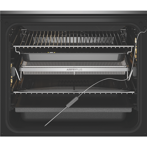 Serve up delicious meals and bakery-style breads thanks to a stunning variety of cooking functions including air frying baking with steam slow cooking grilling and more and enjoy effortless clean up afterwards with the Electrolux 60cm Pyrolytic Steam Oven EVEP616DSE in dark stainless steel. For succulent results the included smart food probe with sensor not only monitors the core temperature of roasts it'll even let you know when the desired temperature has been reached and will automatically stop cooking to prevent foods from drying out. Use the smart sensor food probe in conjunction with one of the cooking functions like Fan Cooking Traditional Bake Fan Assist Bake or Roast. This Electrolux oven comes with pyrolytic-proof side racks and double action telescopic runners so for easy cleaning these do not need to be removed when the self-cleaning pyrolytic function is in play - simply remove the trays and shelves. Plus it has a quadruple-glazed oven door to reduce the outside temperature of the door when the pyrolytic self-cleaning function is in play.