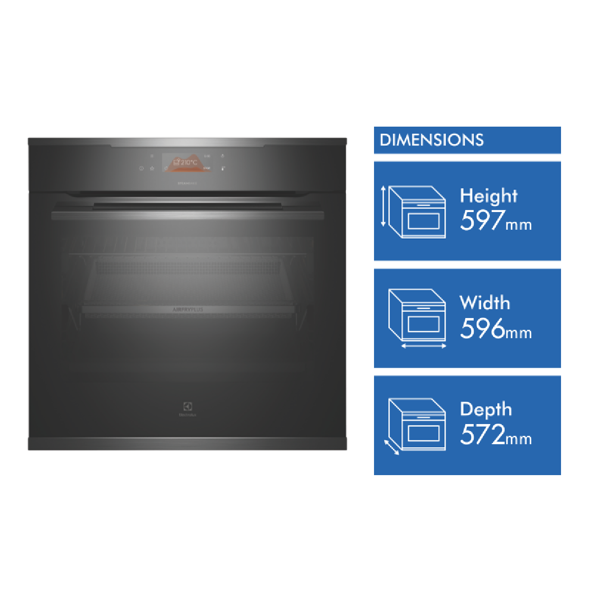 Oven Functions 17: Fan cooking, Fan assist bake, Traditional bake, Roast, Pizza, Pastry, Cook from frozen, Full grill, Grill, Fan grill, Keep warm, Defrost, Dough proving, Slow cooking, Bake plus Steam, AirFry plus