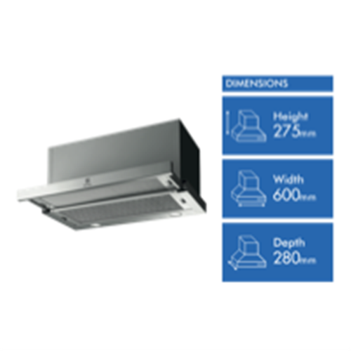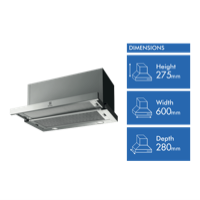 This Electrolux rangehood is a slide out hood. You can reduce cooking smells heat and condensation in your kitchen with its 625 cu m/hr extraction capacity. The Electrolux ERR627SA features LED lighting so you can focus lighting on the area you need it most. It has micro mesh filters and a recirculating design. The Electrolux rangehood's switch controls enable you to control lighting. Plus it has a stainless steel and grey finish. The rangehood has a 600mm width with a 275mm height. You can filter out cooking gases and odours with this Electrolux rangehood.