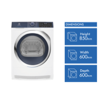 This white Electrolux heat pump dryer has the capacity to dry 9 kg (1kg = the weight of one dry towel) or one king doona which is perfect for households of five or more. The large drum means you do more in each load and fewer loads and it gives clothes more room to move around so they dry thorougly creases are reduced and you spend less time ironing. A heat pump dryer dries fabrics more carefully and efficiently than other types of dryers which protects your clothes and helps with power bill savings. Heat pump dryers don't need to be vented outside so they're perfect if you're renting. Its very high 7 star energy rating enables you to reduce energy use. The white Electrolux EDH903BEWA features 14 types of drying programs so you can select the best setting for each load. It has reverse tumbling bedding delicates and refresh programs. This white heat pump dryer is 850mm high 600mm wide and 600mm deep so take carfeful measurements of where your dryer needs to fit leaving enough room for the door to open.