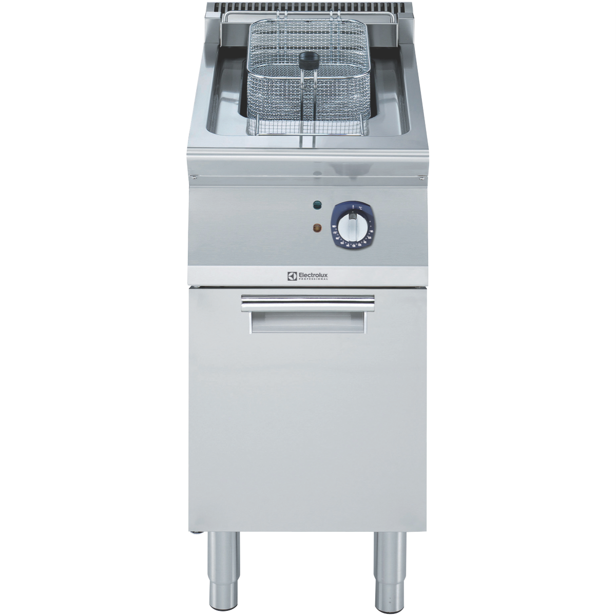 To be installed on height adjustable feet in stainless steel. High efficiency tilting incoloy armoured heating elements (8.7kW) placed inside the well. Deep drawn well. Oil drains through a tap into a container under the well. Exterior panels in stainless steel with Scotch Brite finish. One piece pressed work top in 1.5 mm thick stainless steel. Right-angled side edges to allow flush-fitting junction between units.