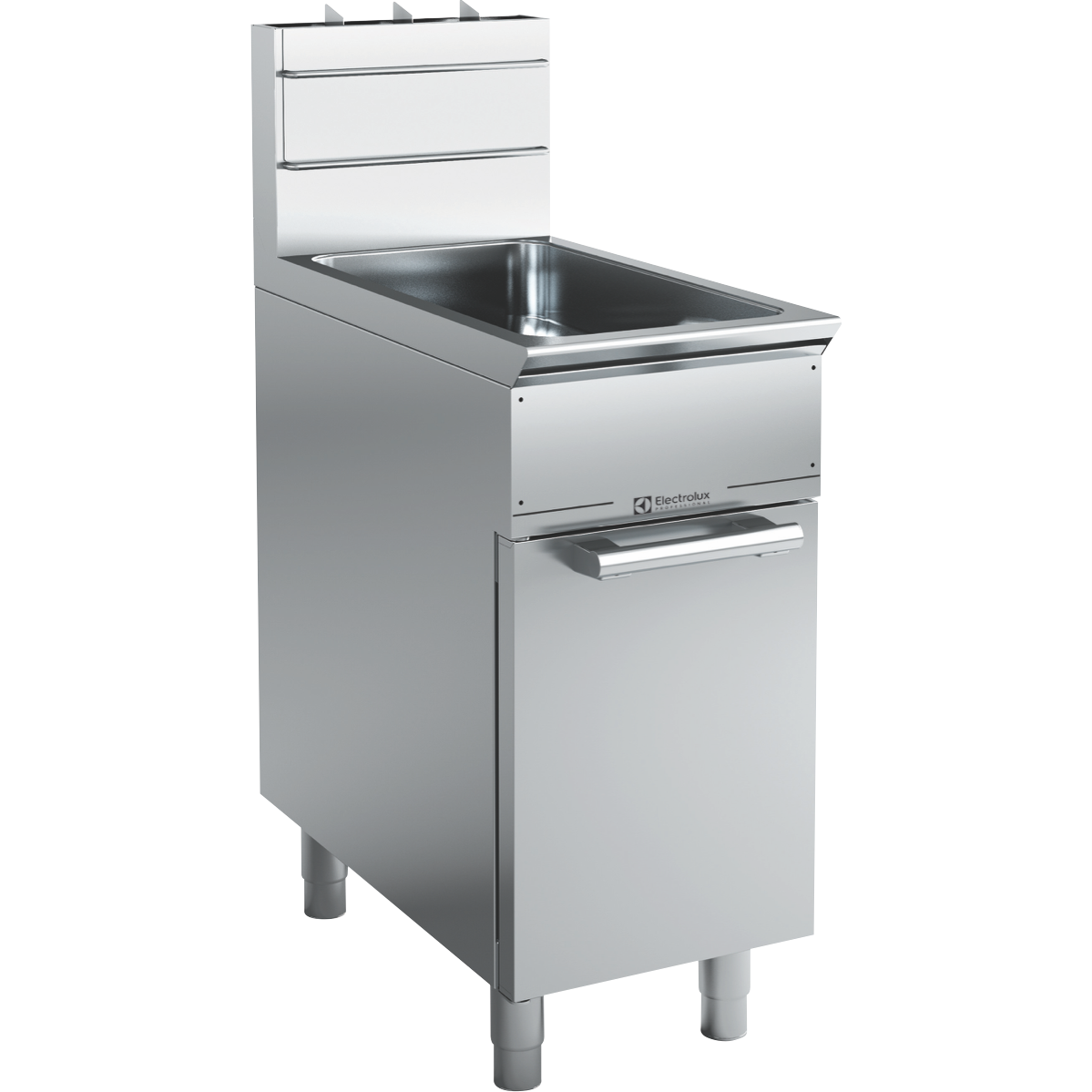 Unit to be Electrolux 40 lb (23 lt) Single Well Gas Fryer. Unit has two high efficiency burners for a total power of 85000BTU (25kW). Suitable for natural gas or propane gas. Unit has deep drawn V-Shaped well. Interior of well with rounded corners for ease of cleaning. Oil drains through a tap positioned under the well. Control knobs provide smooth continuous rotation from min to max. All major components can be accessed from the front of the appliance. Worktop in AISI 304 Stainless Steel. Front and side panels in Stainless Steel with Scotch Brite finish. Special heavy duty chrome plated knobs for durability and easy cleaning. Right-angled side edges to allow flush fitting between units. Supplied with 6 (150 mm) height adjustable removable legs.