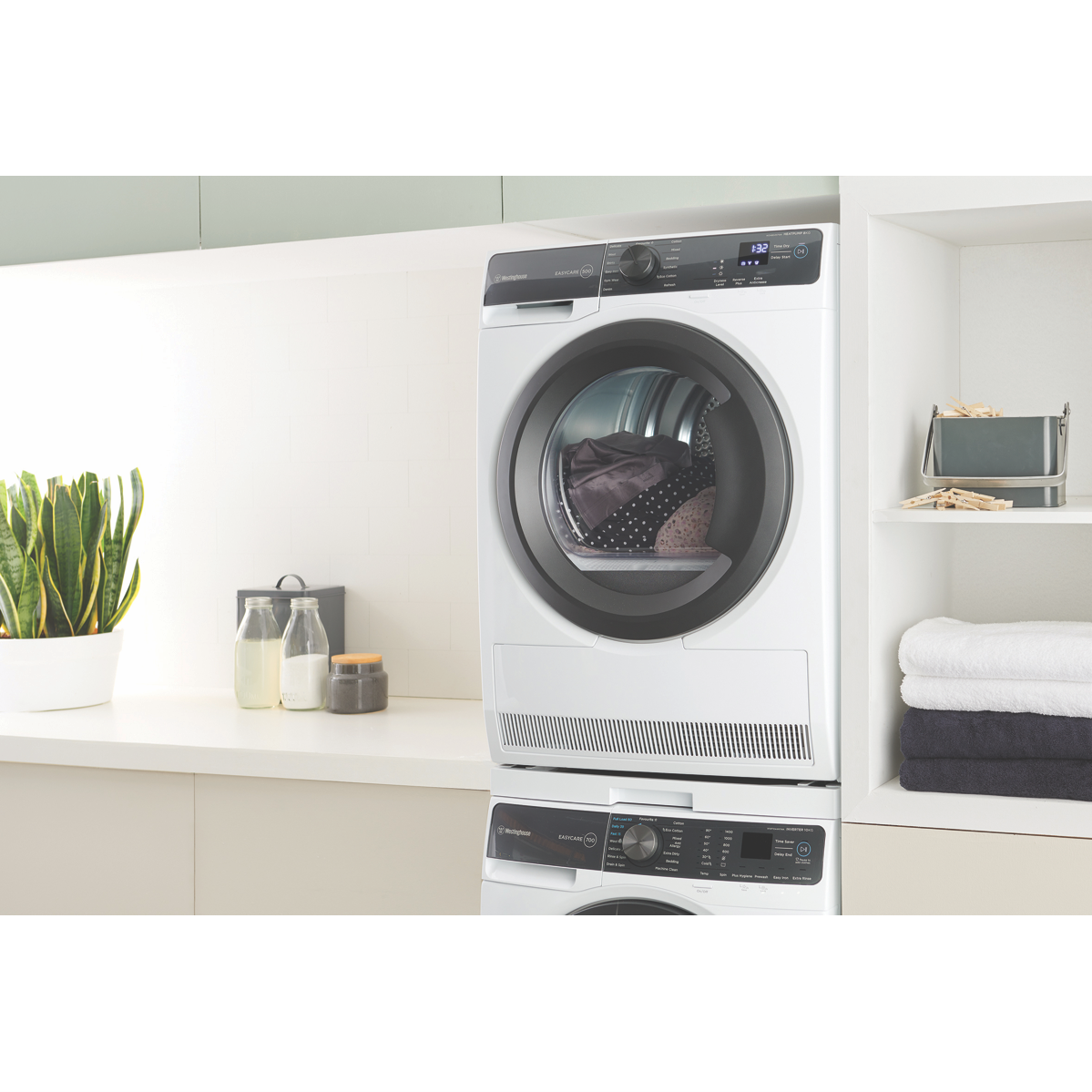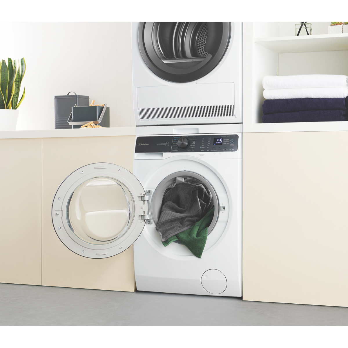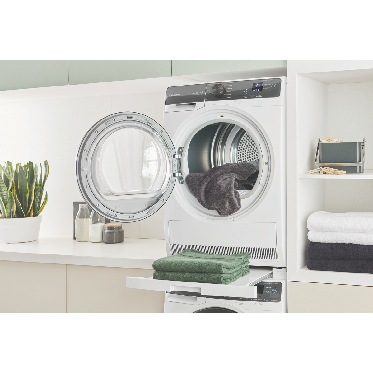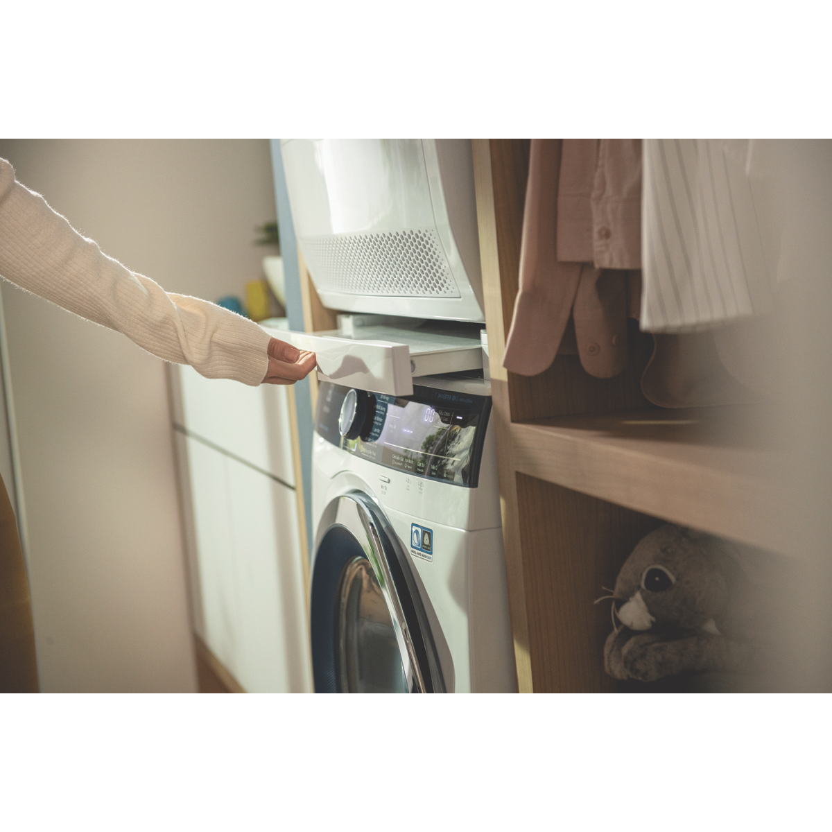 The Electrolux Stacking Kit with Shelf in white provides the perfect solution for maximizing your laundry space. This stacking kit allows you to effortlessly stack your washer and dryer saving precious floor area. The adjustable rear fastening bracket and easy-to-grip moulded handle ensure quick and simple installation. Once assembled the convenient slide-out bench gives you a hidden storage spot great for keeping laundry supplies and accessories organized. With its space-maximizing design this stacking kit is compatible with Electrolux and Westinghouse washers and condenser dryers. Streamline your laundry room and unlock extra space with this versatile white stacking kit. The manufacturer's part number for this product is STA9GW3. Add this innovative stacking kit to your cart today for optimized laundry storage.