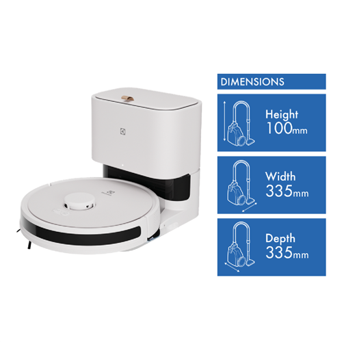 Say hello to your new cleaning companion the Electrolux UltimateHome 700 Robotic Vacuum + Mop (EFR71222DS). This sleek Shell White robot is ready to tackle your floors with ease. With powerful 4000 Pa suction and a versatile design that works on hard floors tiles and carpets you can sit back and let it do the work. The advanced LiDAR sensor technology navigates your home efficiently while the long-lasting Li-ION battery provides up to 140 minutes of uninterrupted cleaning. Plus the handy wet and dry functionality lets you sweep and mop in one go. Measuring just 335 mm wide 335 mm deep and 100 mm high this compact cleaner fits easily into your life. The EFR71222DS also comes with a Clean Station (dust bag required) for effortless maintenance. And with a 2-year manufacturer's warranty you can enjoy worry-free cleaning for years to come.