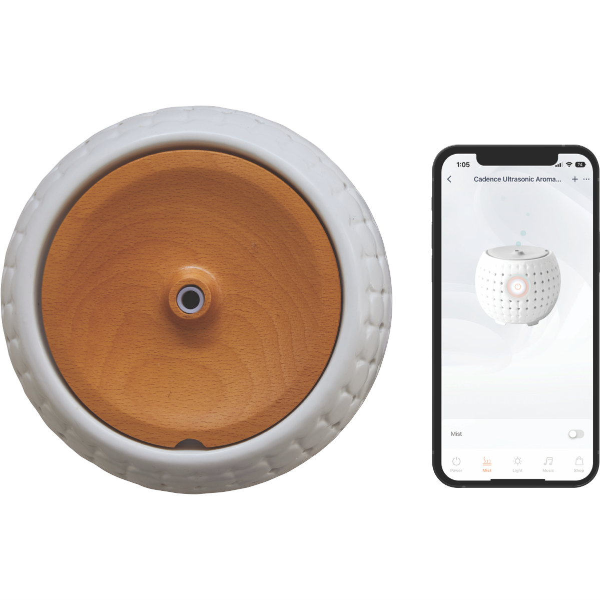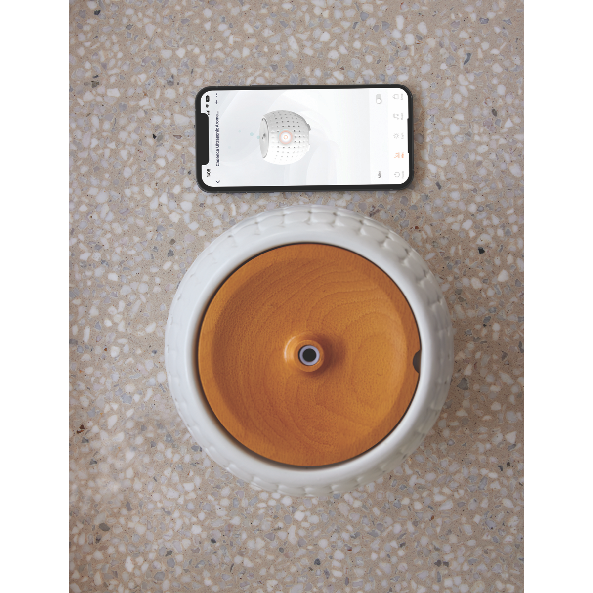 Make your home an oasis of calm with the Ellia Cadence Ultrasonic WiFi Diffuser. This soothing diffuser uses ultrasound waves to disperse essential oils creating a relaxing atmosphere. With WiFi connectivity you can control it remotely through the Ellia app. Choose from uplifting or relaxing sounds with continuous diffusing for up to 10 hours or intermittent diffusing for 20 hours per 200mL tank. The stylish design features a beautiful ceramic cover and wood base. Change the mood with the color changing light. This whisper quiet diffuser adds a touch of tranquility to any room. The manufacturer's part number for this product is ARM-950WT-AU. Bring home the Ellia Cadence Diffuser and experience the relaxing power of aromatherapy.