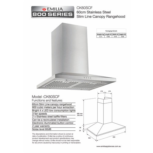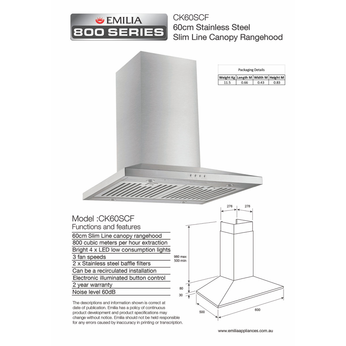Transform your kitchen with the sleek and modern Emilia 60cm Slim Line Canopy Rangehood. This stylish stainless steel hood not only looks great but also offers powerful performance. With a maximum extraction capacity of 800m3/hr this rangehood will quickly clear cooking odors and smoke from the air. Four energy-efficient LED lights illuminate your cooktop brilliantly while electronic push button controls allow easy selection of the three fan speeds. Ducted or recirculated operation gives you flexibility for installation. At just 60dB operation is quiet enough for comfortable conversation. With a width of 600mm height of 1090mm and depth of 500mm the Emilia rangehood is designed to fit above 600mm cooktops and ranges. The stainless steel filters are durable and simple to clean. Enjoy the peace of mind of a 2 year manufacturer's warranty. The manufacturer's part number for this product is CK60SCF. Bring home the Emilia Canopy Rangehood for a stylish quiet and powerful addition to your kitchen.