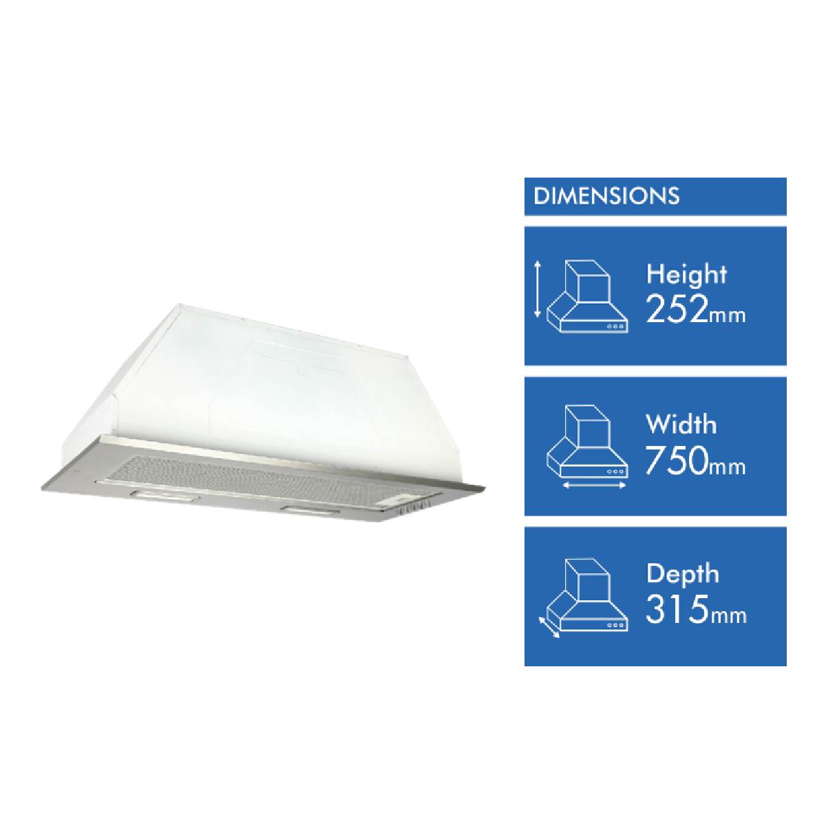 Make a striking statement in your kitchen with the Emilia 75cm Undermount Rangehood. This sleek stainless steel rangehood boasts powerful yet quiet extraction efficiently clearing the air in open plan cooking spaces. With a maximum extraction rate of 700 cubic metres per hour this ducted or recirculating rangehood clears steam grease and cooking odours with ease. The twin square LED lights provide bright focused illumination of your cooktop while the push button controls allow simple operation. The Emilia rangehood features dishwasher safe aluminium filters for straightforward cleaning and maintenance. Designed for durability with its robust stainless steel build this rangehood also has the added protection of a 2 year manufacturer's warranty. With its combination of style power and thoughtful design the Emilia rangehood makes an impressive addition above any cooktop or stove. Let this modern and minimalist rangehood keep your kitchen fresh and steam-free.The manufacturer's part number for this product is CK75UCF.Add this stylish and functional rangehood to your cart today.