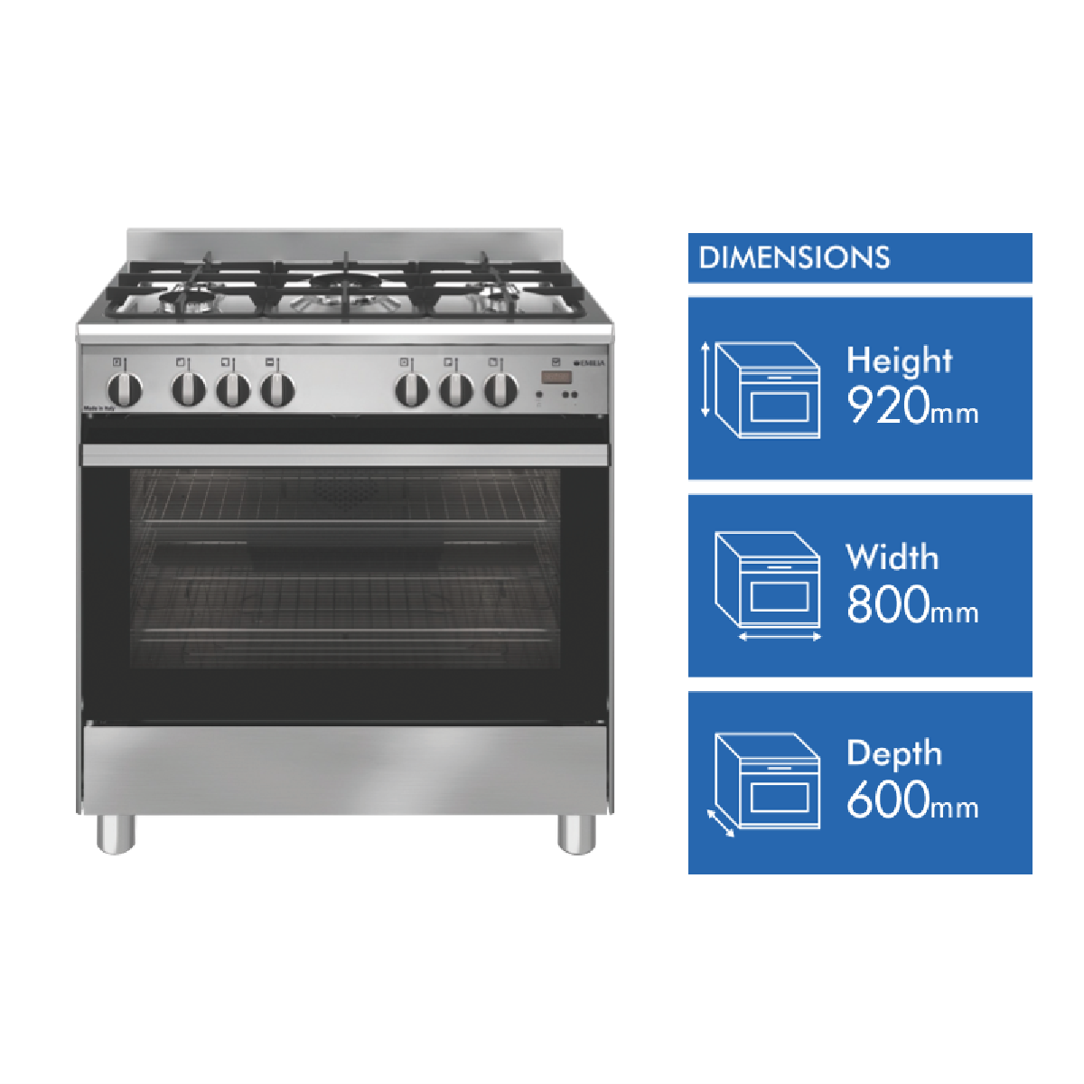 Cook up a storm while saving your electric power bill by using the Emilia 80cm Stainless Steel Gas Upright Cooker. It's five burner design creates a large variety of cooking related options when creating your favourite meals. The 120L interior capacity provides a wide amount of space to fit and cook different types of dishes. Use your oven off only solar power and off the grid with electricity consumption being at 1% of other corresponding cookers; this oven can have an LPG conversion and can be operated during blackouts. For safety reasons if the burner flame extinguishes while cooking the gas flow stops preventing any possible accidents from occurring. Set a reminder of your cooking duration with the preinstalled timer and digital clock that always displays the time of day.