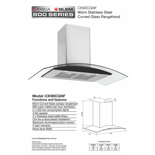 Bring modern style and advanced ventilation to your kitchen with the Emilia 90cm Curved Glass Canopy Rangehood. This sleek stainless steel canopy hood features a stylish curved glass design that will make a statement in your cooking space. With a powerful 800 cubic meter per hour extraction capacity this rangehood will keep your kitchen free of smoke grease and odors. The ultra-quiet 59dB noise level allows the rangehood to operate unobtrusively while the integrated LED lights illuminate your cooktop for safer cooking. Convenient features like 3 fan speeds push button controls and dishwasher safe baffle filters make using this rangehood a breeze. Ducted or recirculating installation gives you flexibility for any home. And with a width of 900mm height of 1045mm and depth of 500mm this rangehood is sized to fit above most 90cm cooktops and ranges. Bring fresh air and sophisticated style to your kitchen with the Emilia 90cm Curved Glass Canopy Rangehood today.The manufacturer's part number for this product is CK90CGNF. Discover how this rangehood can transform your cooking space now.