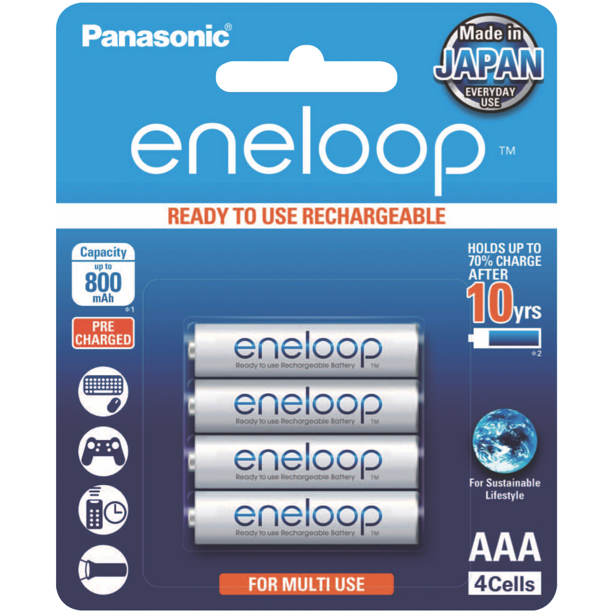 Use eneloop batteries to get more out of high drain devices such as digital and flash cameras toys game controllers flashlights and more. Due to their power retention capabilities eneloop batteries are also perfect for low drain devices such as remote controls and smoke alarms.Panasonic s eneloop batteries are pre-charged using solar power so they are ready to use as soon as you take them out of the packet. Even after 10 years storage eneloop batteries still hold up to 70% charge so you can be certain that they will always be ready for action.