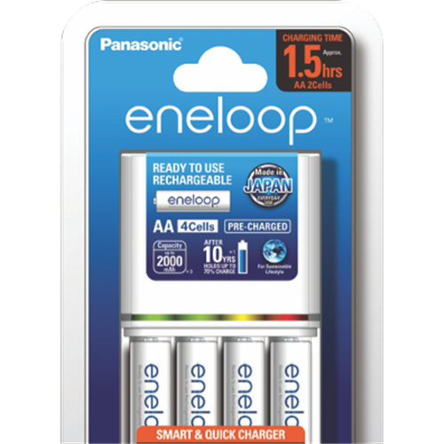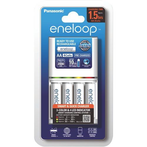 Charge up your world with the Eneloop AA/AAA Quick Charger and 4 AA rechargeable batteries. This versatile charger powers up AA and AAA Eneloop batteries in just 3 hours so you'll always have charged batteries on hand. The advanced charging system monitors voltage and temperature to protect your batteries. Eneloop batteries can be recharged up to 2100 times and retain 70% of their charge after 10 years when not being used making them ready whenever you need them. With no memory effect you can recharge them anytime without fully draining first. These pre-charged Ni-MH batteries arrive ready to use straight from the package. Providing reliable power for cameras toys remotes and more Eneloop batteries combine eco-friendly technology with superior performance. Their low self-discharge minimizes the need to frequently replace batteries reducing waste. For convenient charging and endless reusability power up your world with the Eneloop Quick Charger and AA batteries today. The manufacturer's part number for this product is K-KJ55MCC4TA. Check out this Eneloop charger and batteries set for all your power needs.