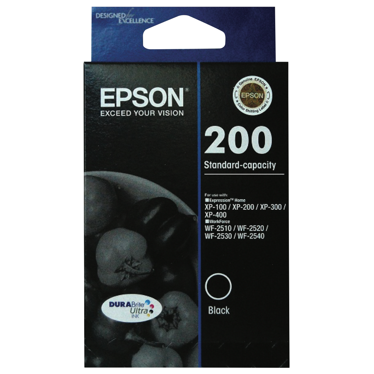 Print on demand with the Epson 200 DURABrite Black Ink Cartridge. This cartridge delivers crisp high-quality black text for all your documents and photos. With the ability to print up to 500 pages you can rely on rich smudge-resistant blacks that won't run or bleed through paper. Designed for maximum compatibility this cartridge suits a range of Epson printers including the XP-100 XP-200 XP-300 XP-310 XP-400 XP-410 and the WorkForce WF-2510 WF-2520 WF-2530 and WF-2540. Now you can enjoy convenient at-home printing without the hassle of faded blacks or blurred pages. Order the Epson 200 DURABrite today and experience bold better blacks for all your print projects.