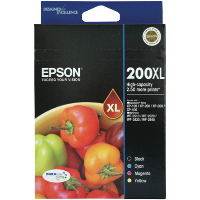 Take your printing to the next level with this 4 pack of Epson 200 DURABrite XL ink cartridges. These high-capacity cartridges deliver vivid colour prints with laser-sharp text perfect for all your documents and photos. The DURABrite XL ink produces smudge fade and water resistant prints that will look as good as the day you printed them even after years of storage. Compatible with a wide range of Epson printers like the XP-100 XP-200 XP-300 XP-310 XP-400 XP-410 and WorkForce WF-2510 WF-2520 WF-2530 WF-2540 you can rely on these cartridges for up to 450 pages of flawless printing. With the ability to print lab quality photos and laser quality text on plain paper envelopes and photo paper these cartridges let you print anything you need quickly and easily. For uninterrupted printing and exceptional results every time choose the Epson 200 DURABrite XL 4 pack. The manufacturer's part number for this product is T201692. Give your printing an upgrade with these long-lasting ink cartridges today.