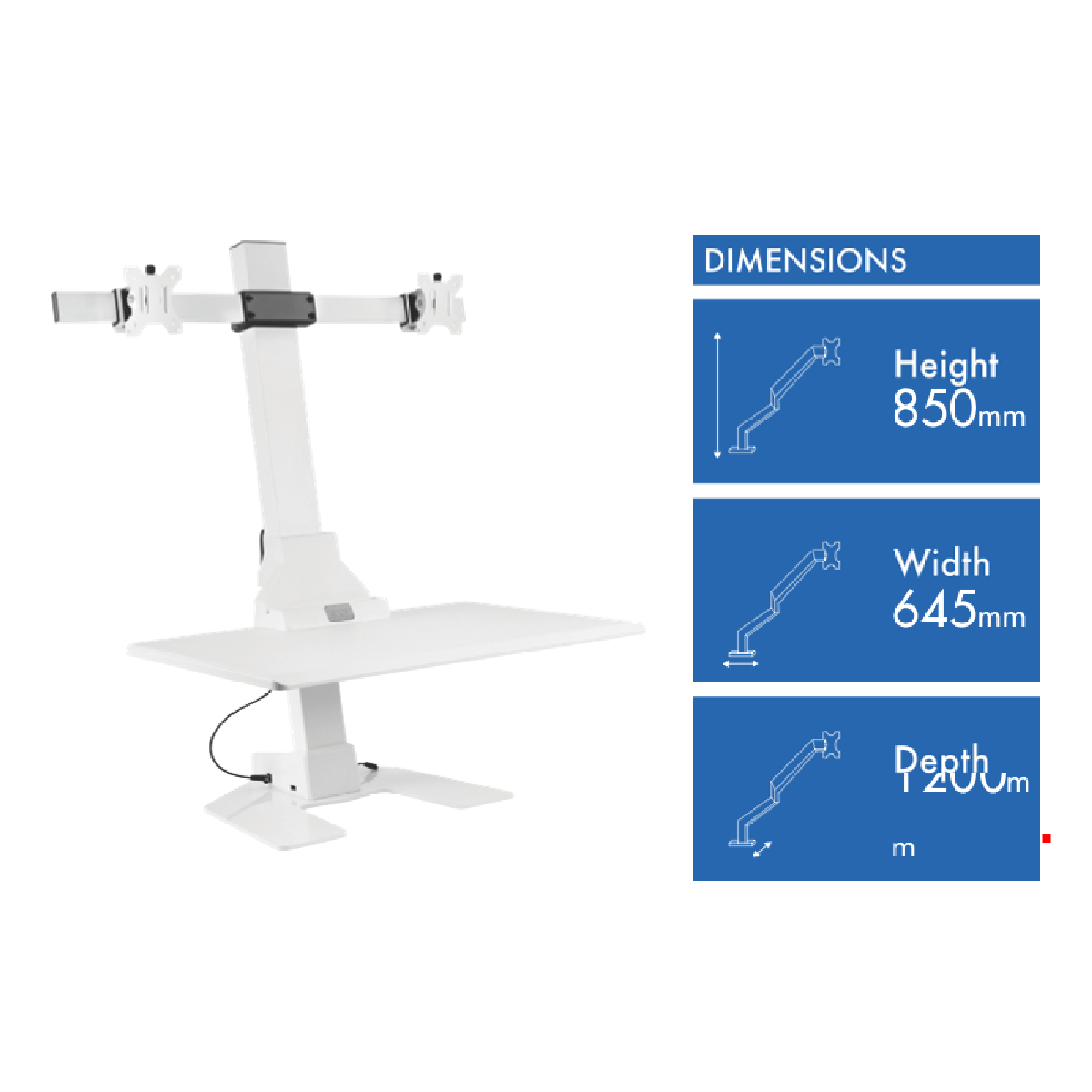 Enhance your productivity and maximize your workspace with the Ergovida Dual Monitor Electric Workstation in crisp white. This adjustable monitor mount frees up precious desk space by elevating two screens up to 27 inches allowing you to reduce clutter and focus on the task at hand. The durable steel construction provides stability while the gas spring arm enables smooth effortless adjustments to find your ideal viewing position. Tilt swivel and rotate both monitors independently to minimize glare and strain. Designed for ergonomic comfort this monitor stand promotes healthy posture by elevating screens to eye level reducing neck and back pain. Cable management clips keep wires neatly hidden away. Installation is quick and easy with the included hardware. Experience the freedom to spread out and stay organized with this dual monitor mount that brings flexibility and comfort to your home office. The manufacturer's part number for this product is EDT10-T02W. Transform your workspace today.
