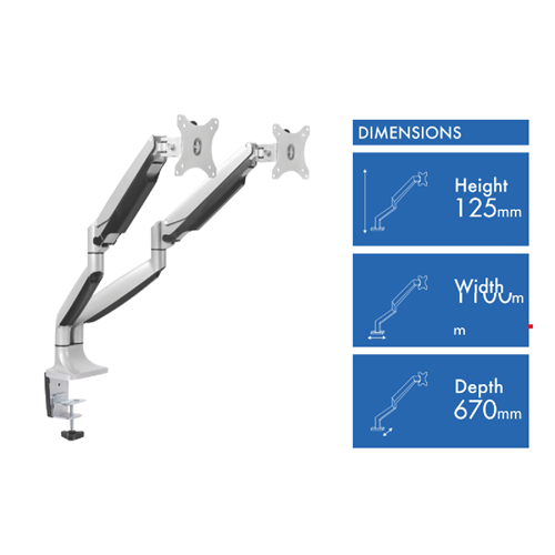 Additional Features Gas spring perfectly counterbalances the weight of your monitor, Built-in spring gauge, 360 Rotary VESA plate, Cable management, Grommet and desk clamp mounting