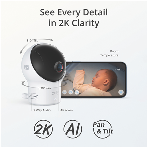 eufy Wi-Fi Baby Monitor Security Camera 2K Resolution with Pan & Tilt AI Cry Detection Night Vision Sound and Room Temperature Detection Baby Camera Monitor Requires 2.4GHz Wi-FiKey FeaturesIt's in the 2K DetailsThe 2K high-resolution camera with 330° pan 110° tilt and 4x zoom features lets you watch over your baby in stunning detail.Night VisionThe non-invasive infrared night vision lets you check on your baby at night without getting out of bed.Sound and Room Temperature DetectionBaby Monitor 2 will continuously read the noise levels and temperature of the room alerting you to drastic changes such as excessive noise.Privacy FirstWi-Fi is optional safety is not. To protect you and your baby's privacy all your data will be stored locally but accessible anytime and anywhere with an AES 128-bit encryption.Check on Your Baby Anytime AnywhereUse the eufy Baby app to check on your baby talk to them in real-time and more whenever you want.
