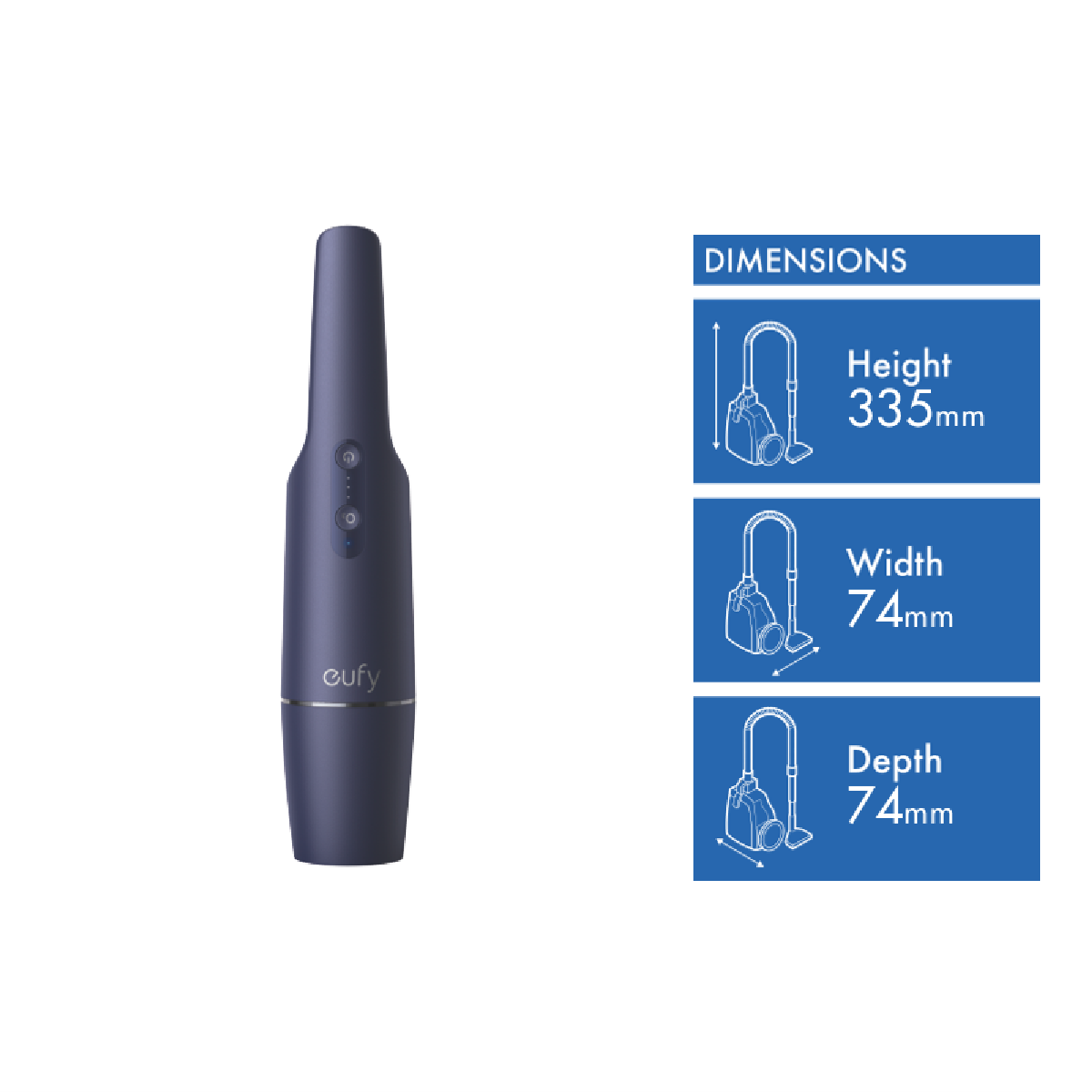 Clean and clear your everyday surfaces with the effortless eufy Pure Air Handheld Vacuum Blue. This lightweight 0.60kg handheld vacuum packs 5000Pa of suction power into a compact 335 x 74 x 74mm frame to lift dust and debris from floorboards tiles carpet seats chairs desks and more. The included 2-in-1 combo tool tackles both crevices and upholstery while the bagless washable filter cuts down on costs. Recharge via USB when power runs low. With up to 15 minutes of fade-free suction per charge this cordless vacuum makes quick work of messes in your home or car. At just 74mm wide it's easy to store and whip out when unexpected spills occur. The long-lasting lithium polymer battery stands up to repeated use so you can keep your spaces spotless for years to come. Rest assured with the included 1 year manufacturer's warranty. Light portable and packed with power the eufy Pure Air Handheld Vacuum Blue brings effortless cleaning anywhere. Order yours today.