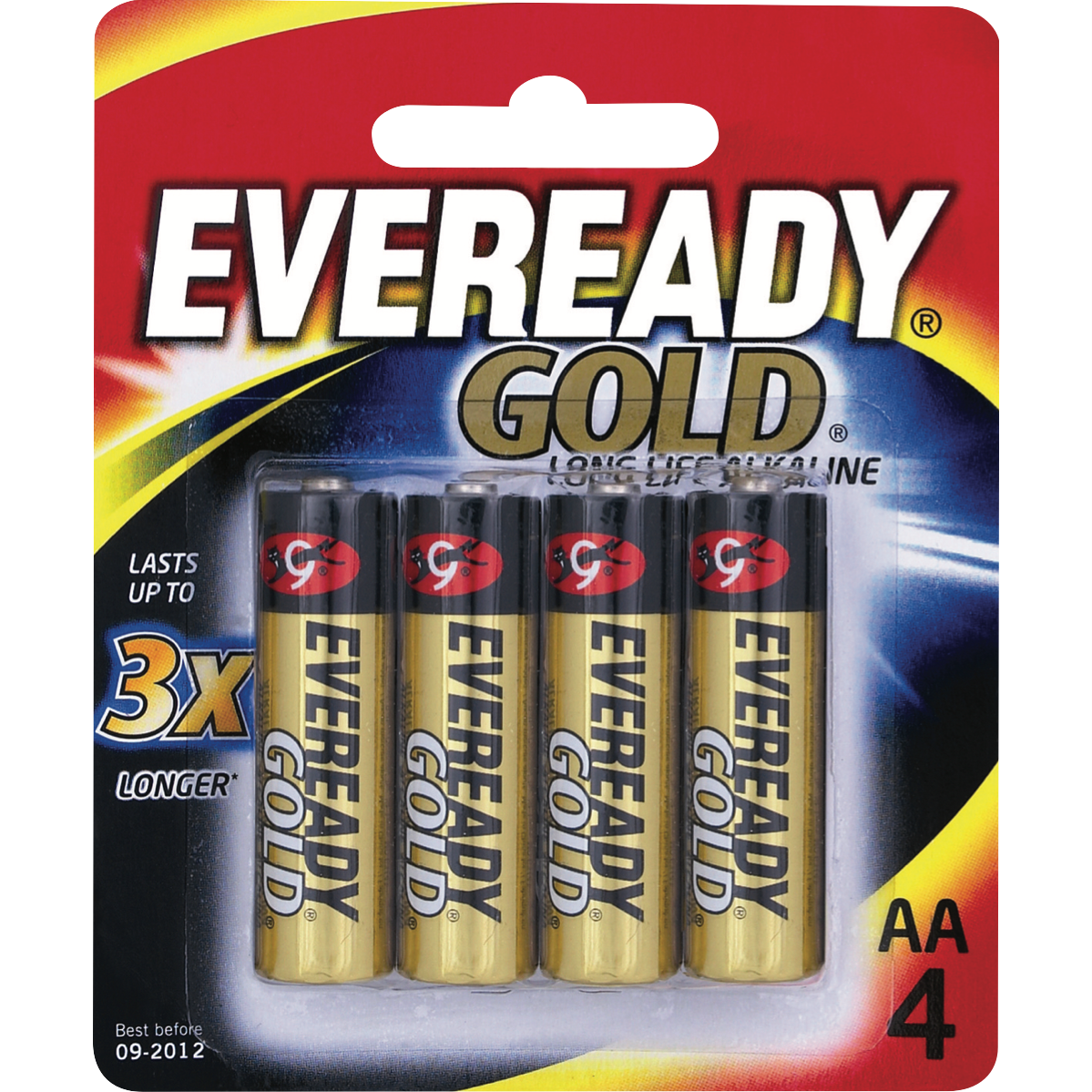 Power up your devices with long-lasting energy from the Eveready Gold AA Batteries 4 Pack. These high-performance AA batteries provide reliable power for everything from toys and remotes to flashlights and more. The 4-pack gives you a convenient multi-battery value option so you can stock up on power while saving money. Each AA battery is designed for optimal performance and longevity with leak-resistant construction that allows you to power your devices without worry. These versatile batteries feature the trusted Eveready Gold name delivering the portable power you expect in AA form. Whether you need to power game controllers clocks toys or any number of electronic gadgets reach for the lasting energy of Eveready Gold. These AA batteries bring convenient and dependable power in a 4-pack value size. The manufacturer's part number for this product is E000034400. Give your devices the portable power they need with the Eveready Gold AA Batteries 4 Pack.