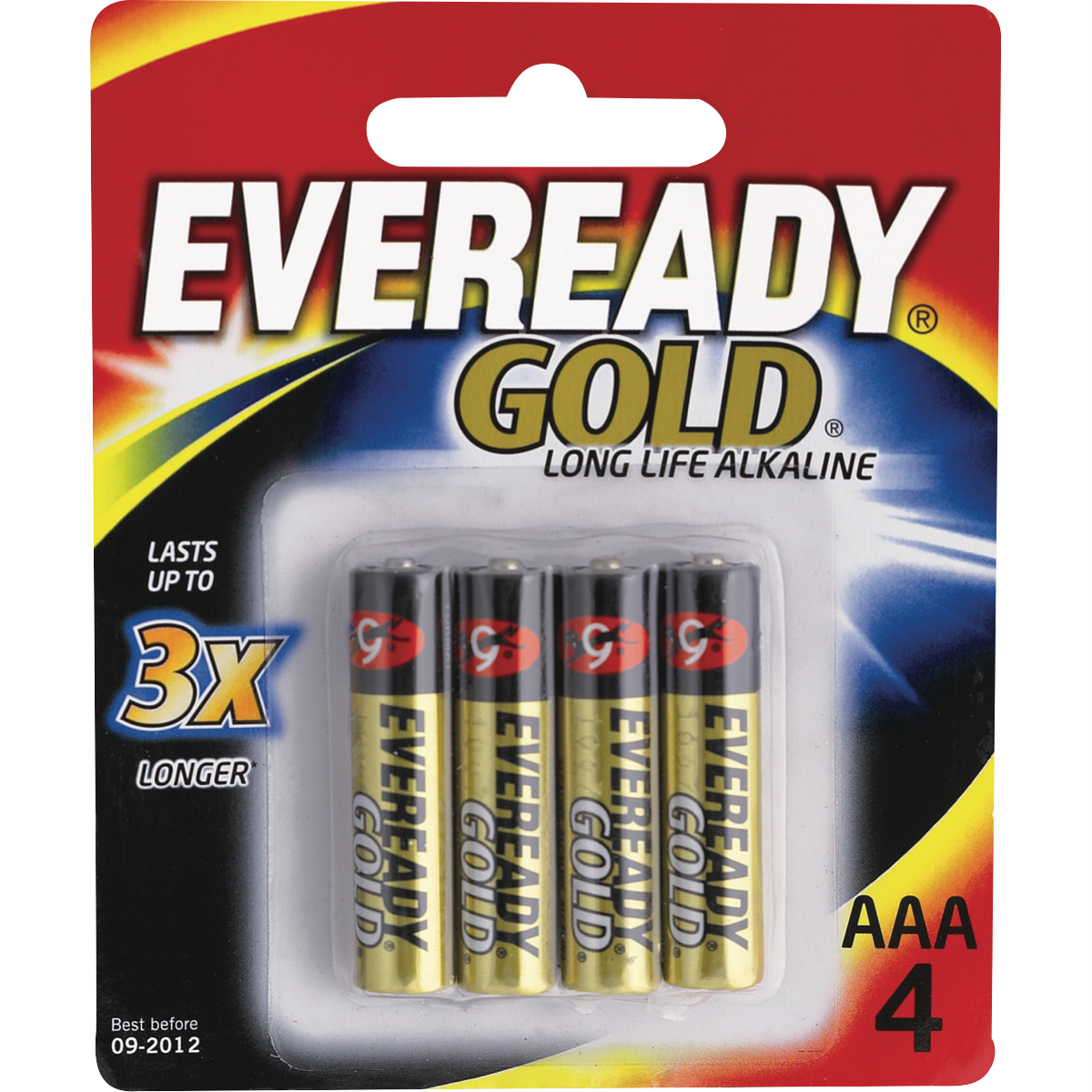 Power up your devices with the long-lasting performance of Eveready Gold AAA Batteries. These premium batteries provide reliable power for everything from remote controls to toys flashlights and more. The 4-pack of AAA batteries is ideal for households that go through batteries quickly. Eveready Gold batteries deliver up to 10 hours of continuous use in high drain devices giving you the confidence that your devices will keep working when you need them. Their sustained power output makes them a versatile choice for any AAA battery-operated device. Plus their leak-resistant construction protects your valued electronics. Bring reliable and long-lasting battery power into your home with the 4-pack of Eveready Gold AAA Batteries. The manufacturer's part number for this product is E300577300. Check out this battery pack today for your power needs.