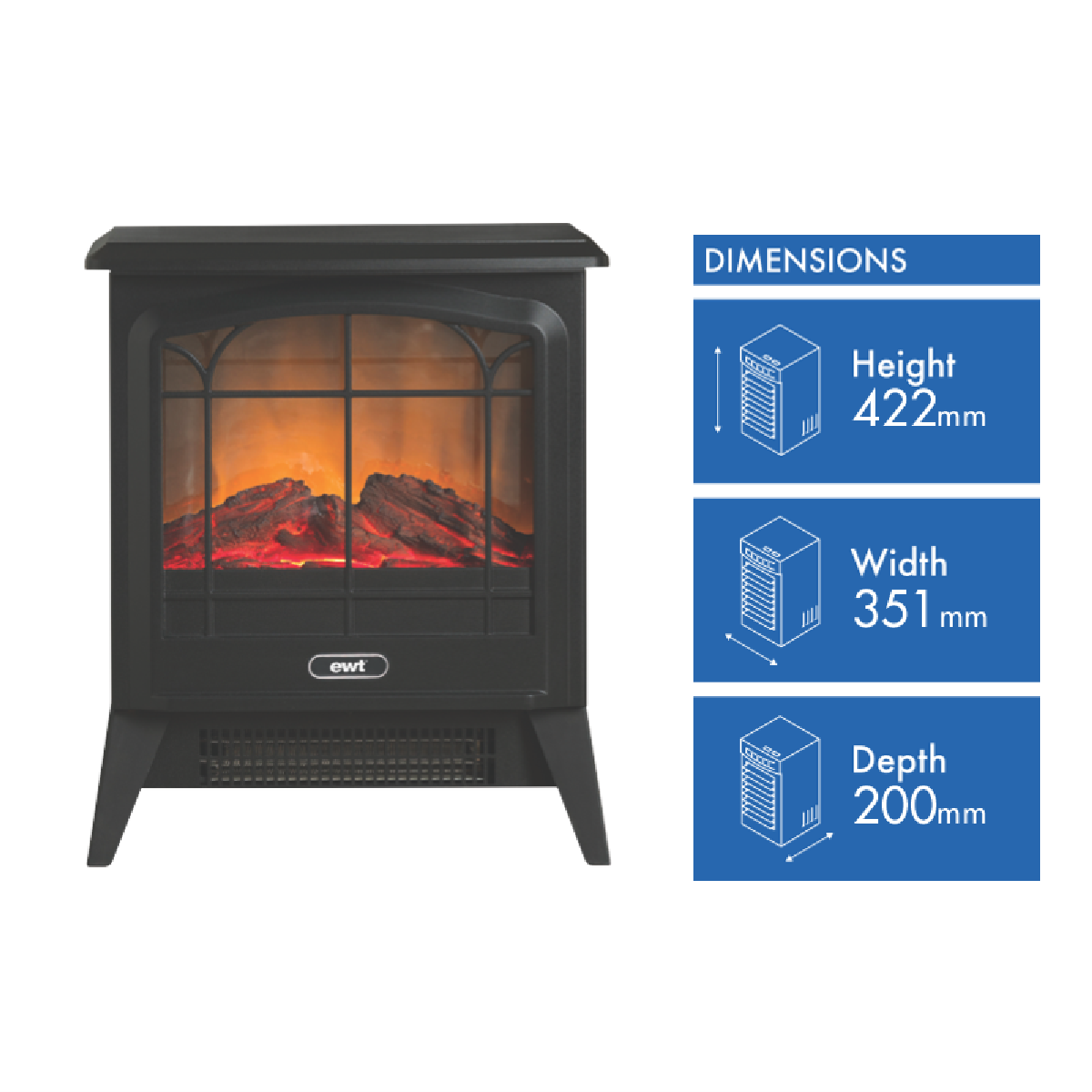 Add a warm glow to your space with the EWT 1.2kW Dinky Mini Electric Fire. This compact portable electric fireplace provides 1.2kW of heating power in a lightweight easy-to-move design. With its black cast effect finish and realistic flame illusion this mini fireplace creates cozy ambiance perfect for bedrooms studies or other small rooms. The two heat settings allow you to adjust the temperature to your comfort level. Just plug it in switch it on and let the Dinky Mini Fire provide supplemental zone heating without costly installation. Place it on any flat surface or mount it on a wall to save floor space. The cool-touch exterior prevents accidental burns for safety around children and pets. Enjoy up to one year of reliable operation with the included manufacturer's warranty. The EWT Dinky Mini Electric Fireplace - a small yet mighty way to add warmth and style. The manufacturer's part number for this product is DNY12-AU. Give your space a stylish heat source with the EWT Dinky Mini Electric Fireplace today.