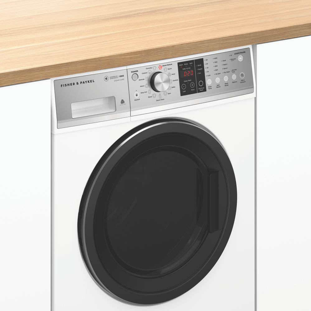 Revolutionize your laundry with the Fisher & Paykel 10kg Front Load Washer. This powerful front loader packs a 10kg load capacity and 1400rpm max spin speed for fast efficient washing. With a 4.5 star WELS water rating and 4.5 star energy rating you can save water and energy while keeping clothes looking their best. Thirteen versatile programs like Bulky Delicate Eco and Steam Refresh cater to every fabric and load size. Quiet yet durable this washer features load sensing auto balancing and a two year warranty so you can enjoy whisper quiet performance for years to come. Additional features like Wi-Fi connectivity Add A Garment and Customize Cycle provide advanced control over every wash. Harnessing the gentle power of steam the Steam Refresh cycle freshens garments without washing. From bulky bedding to delicate silks the Fisher & Paykel 10kg Front Load Washer delivers a thorough clean while maximizing efficiency. With innovative features tailored to suit any laundry load this front loading washing machine streamlines chore time. The manufacturer's part number for this product is WH1060P4. Learn more about how this washer's customized cycles and energy saving performance can benefit your home.