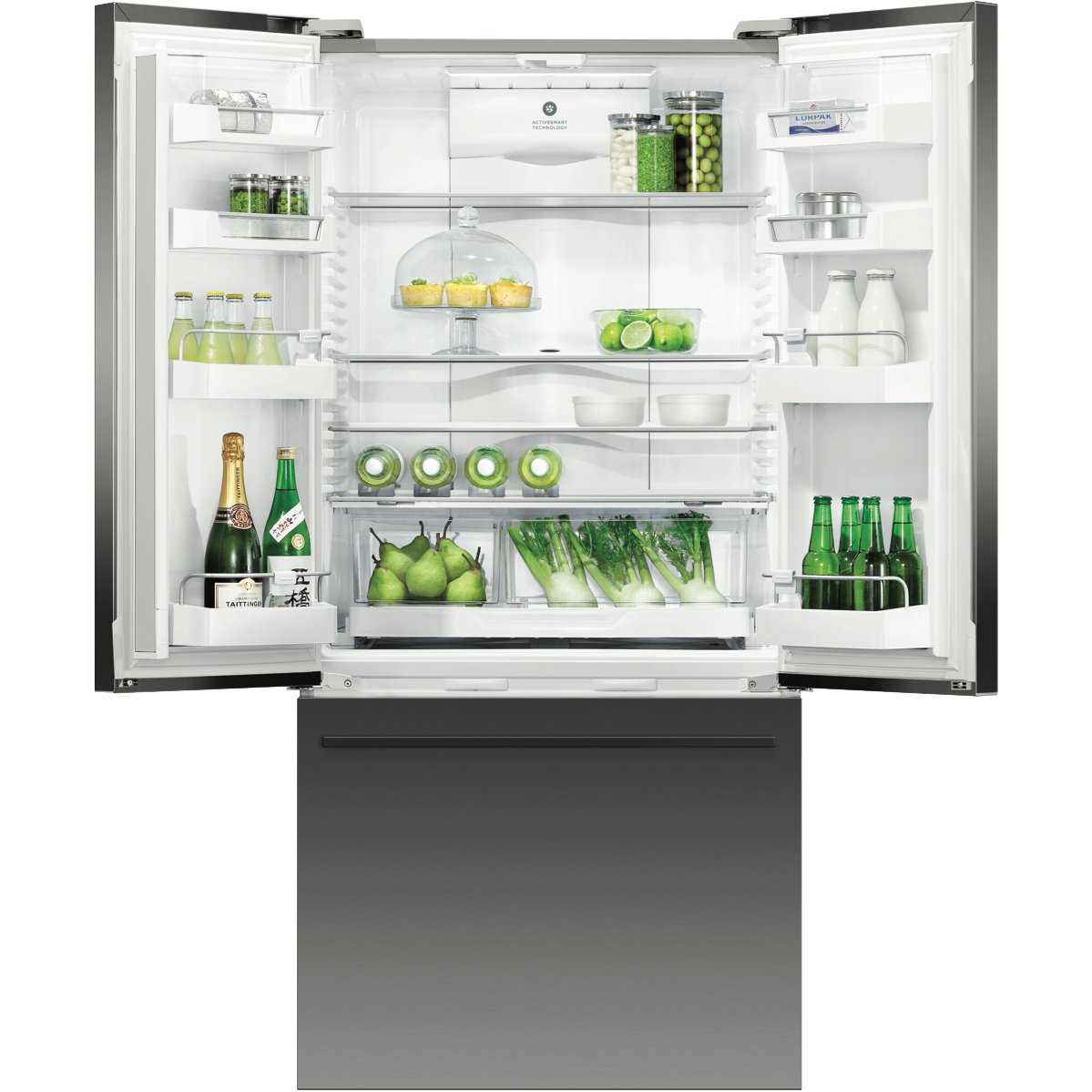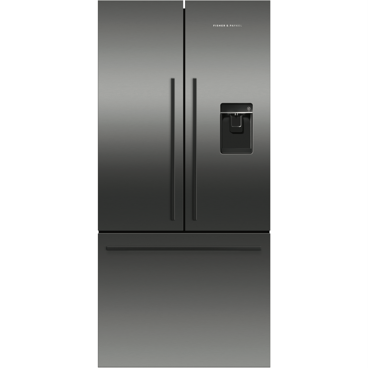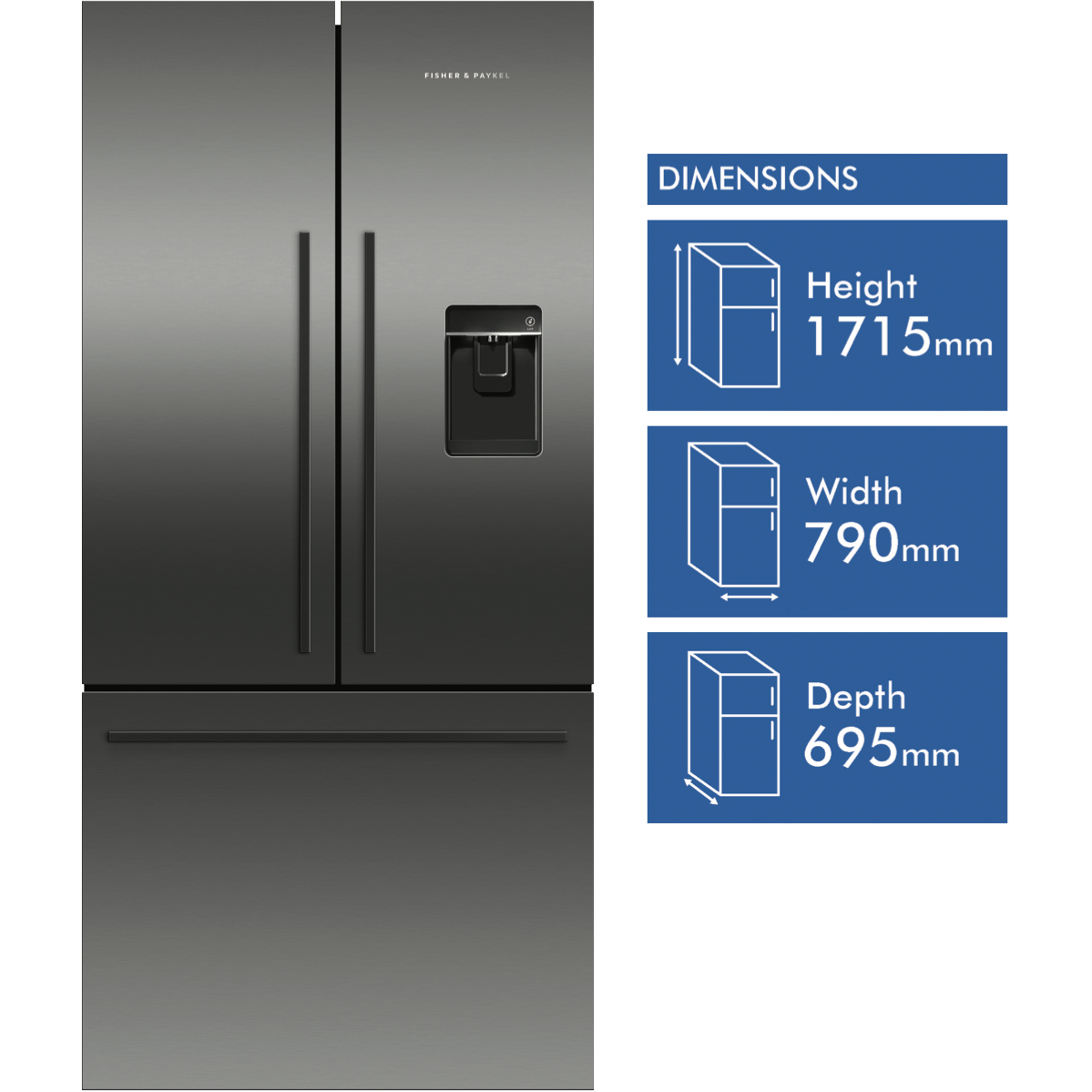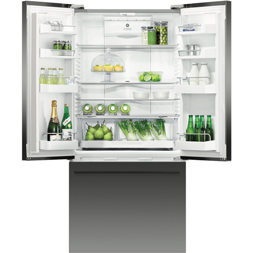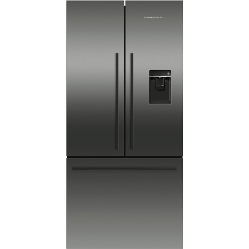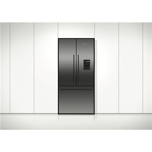 Make entertaining a breeze with the spacious Fisher & Paykel 487 litre French Door fridge in sophisticated black stainless steel. This modern refrigerator features a left and right-hand split French door design that gives you easy access to all your fresh food. The large 487 litre total capacity includes a cavernous 345 litre fridge space and a 142 litre freezer section providing plenty of storage for a family's weekly shopping. LED lighting illuminates the interior so you can quickly find ingredients for recipes or midnight snacks. The multi-flow air delivery system circulates cool filtered air evenly throughout the fridge and freezer compartments so food stays fresher longer. Adjustable glass shelves let you customize the storage to fit taller items while the humidity controlled crisper bins keep fruit and veggies full of nutrients. Entertaining is easier with the ice and chilled water dispenser that eliminates opening the doors. Enjoy chilled filtered water and ice on demand. This fridge also has smooth close doors and spill safe glass shelves for added convenience. With an energy rating of 3.5 stars this Fisher & Paykel French door fridge combines modern style and everyday functionality. The manufacturer's part number for this product is RF522ADUB5. See the Fisher & Paykel 7 Series French Door Fridge at your local appliance retailer.