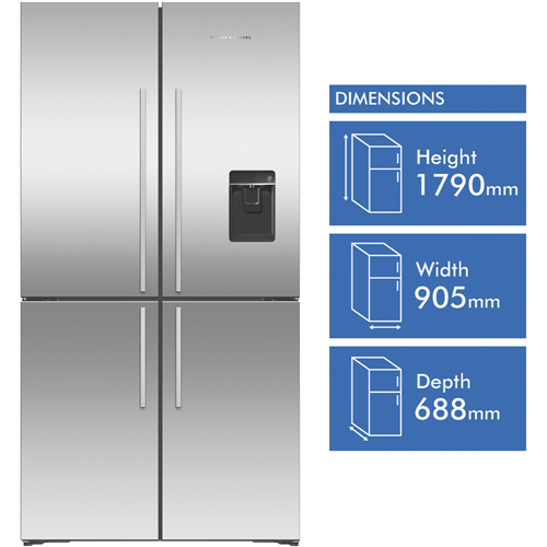A beautifully designed spacious 538L Fisher & Paykel Series 7 Quad Door Refrigerator that keeps food fresh and organized for the whole family. With a generous 341L fridge capacity and 197L freezer capacity this stainless steel fridge delivers advanced food care in a sleek package. The 4-star energy rating ensures energy efficiency while the ice and water dispenser provides refreshing chilled water and ice on demand. Dual hinged doors allow for easy access throughout the cavernous interior. The variable temperature zone with 4 modes enables you to customize cooling for different foods. With a width of 905mm height of 1790mm and depth of 688mm this refrigerator fits well in most kitchens. Backed by Fisher & Paykel's 2 year warranty this fridge will keep groceries chilled and organized for years to come. The manufacturer's part number for this product is RF605QDUVX2. See how this Fisher & Paykel fridge can upgrade your kitchen.