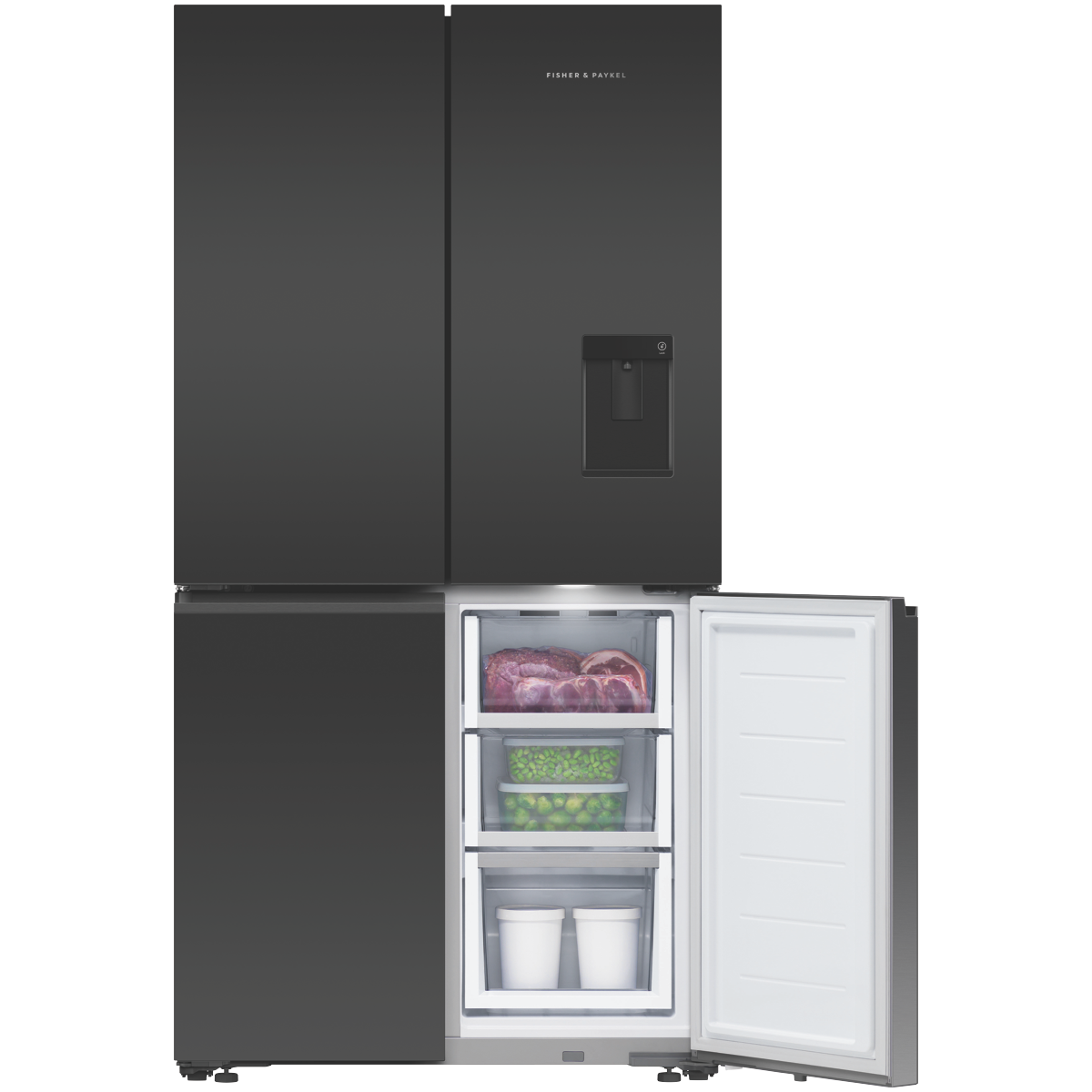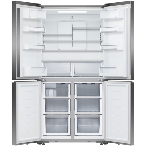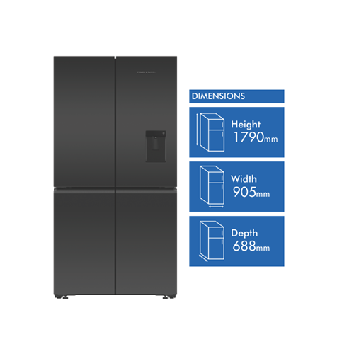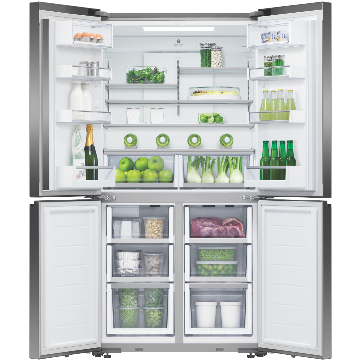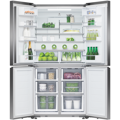 Store your food and drinks for nights of dinner entertainment or simply organise your week shopping in the expansive and spacious Fisher & Paykel 538L Quad Door Refrigerator RF605QZUVB1. Variable Temperature Zones give you the control to look after the wide variety of food you purchase; simply select a setting and the adjustable lower right compartment will change to suit your refrigeration needs convert this section into a freezer soft freezer chiller or normal fridge to maximise your fridge possibilities. Chill Mode helps to keep your favourite meats fish and poultry cool while maintaining its taste and freshness for three times longer than fridge mode. Also its perfect for easily chilling beverages for a prefect summer day refresher. Soft Freezing takes the work out of defrosting your frozen food; it maintains the perfect temperature for your storing necessary ingredients or easily grabbing a bite of some delicious snacks. Let your Fisher & Paykel fridge manage the condition of the interior capacity; ActiveSmart Foodcare adjusts the temperature airflow and humidity to maintain the freshness and taste of your food and drink for longer. Quality design comes hand in hand with refrigeration efficiency; robust and quality materials stainless steel exteriors glass interior shelving recessed handles and black glass finishes creates a luxurious and high end appliance that s perfect for all modern kitchen decors. Always have ice available to you using the easy to use Ice Maker; use it during the hot summer months to cool down and turn it off when you require more freezer space.