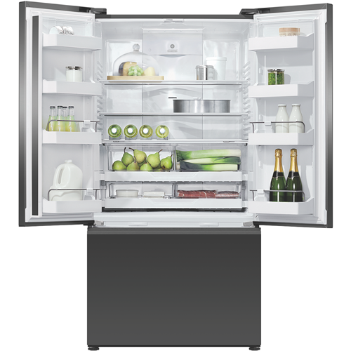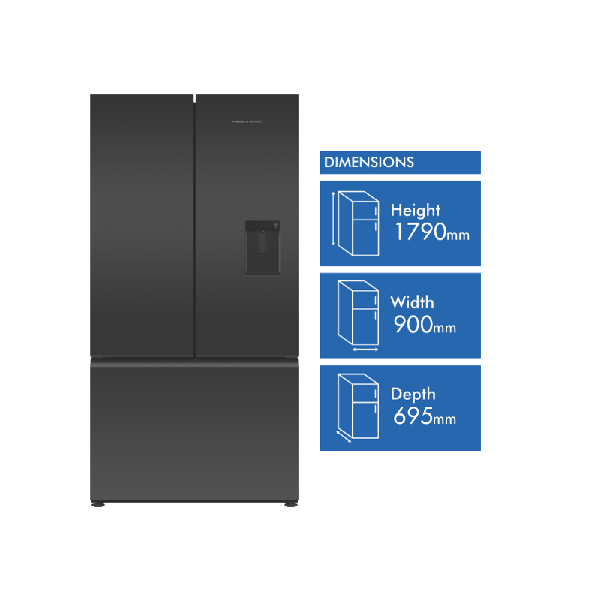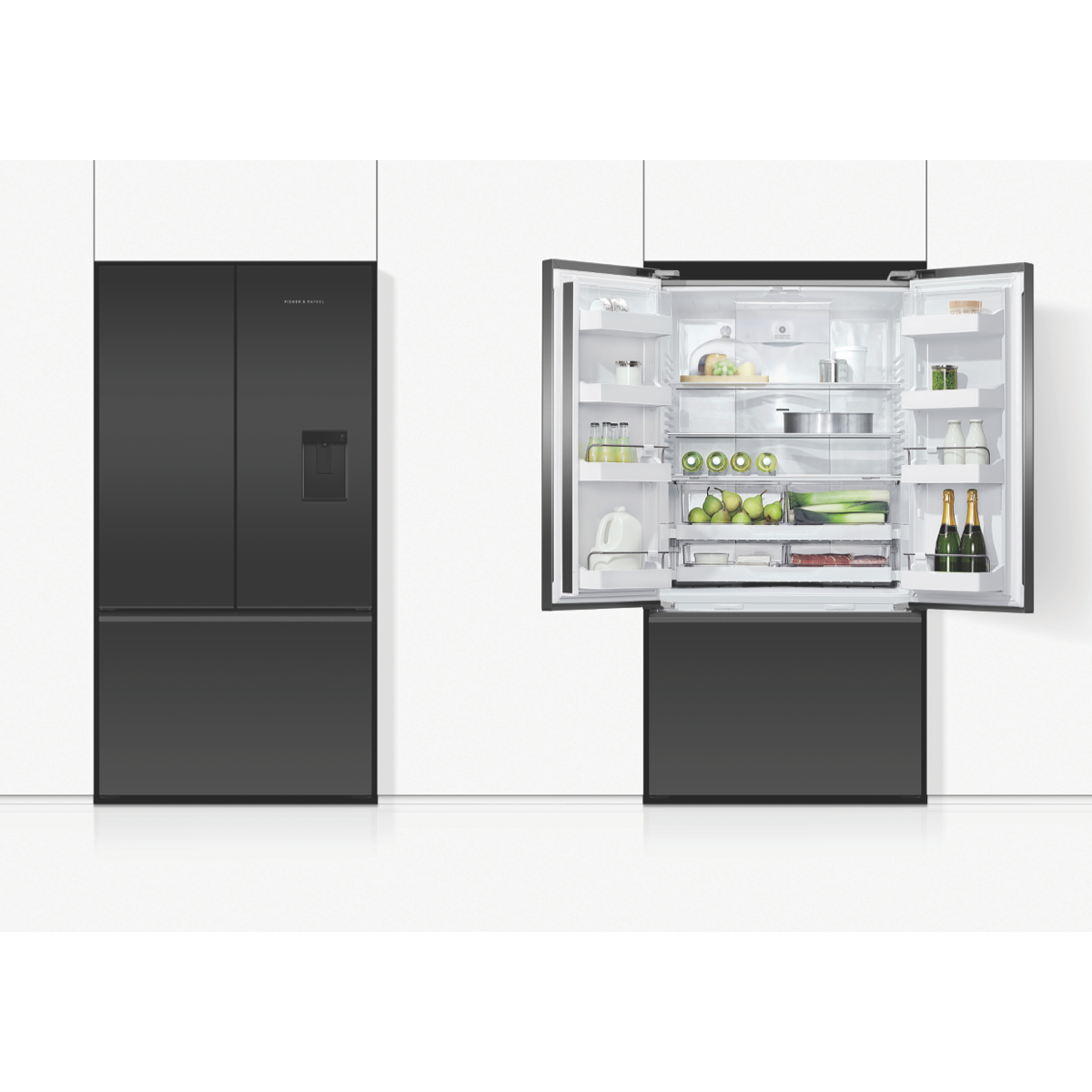 This sleek black French door refrigerator from Fisher & Paykel's premium Series 7 range will transform your kitchen with its stylish design and innovative food care technology. With a generous 569 litre total capacity including a spacious 417 litre fridge and 152 litre freezer this appliance provides ample fresh food storage for the whole family. The intuitive ActiveSmartTM system tracks usage patterns and adjusts cooling and defrosting accordingly keeping food fresher for longer. Clever Energy technology further optimizes efficiency for cost savings while the ice maker and slimline water dispenser provide chilled water and ice on demand. Additional features like humidity control soft-close doors and sleek matte black finish ensure this refrigerator looks as good as it performs. When you choose Fisher & Paykel you choose innovative food care backed by a 2 year manufacturer's warranty. With its superb blend of style space and intelligent food care this French door model is the ultimate modern refrigerator for Australian homes. The manufacturer's part number for this product is RF610AZUB5. Bring home the ultimate in food freshness and family convenience with this Fisher & Paykel refrigerator today.
